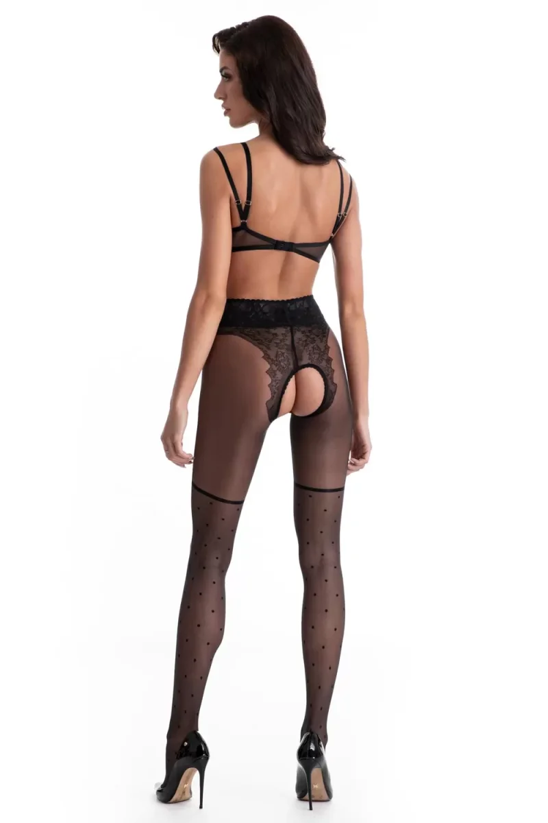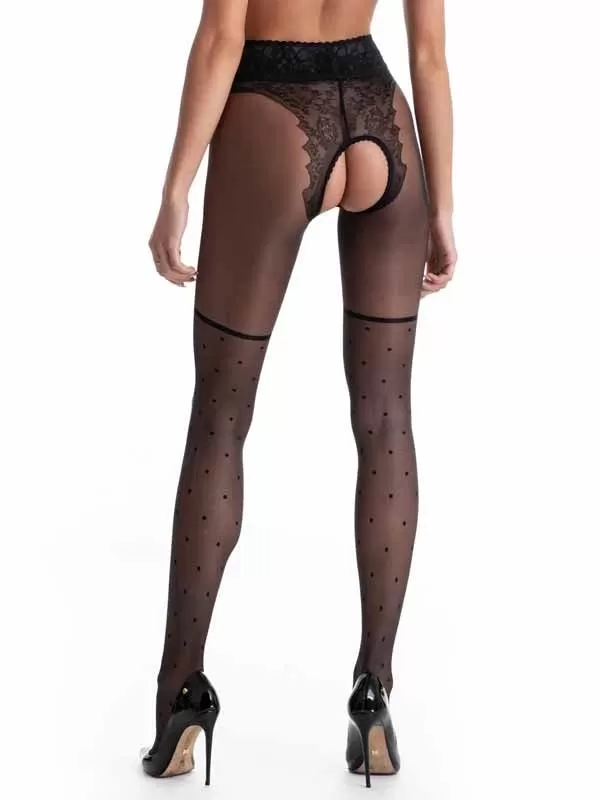 Black tights with an open crotch and a sophisticated, original design, with bands that visually evoke the sexy effect of polka dot hold-up stockings. The tights are decorated with a design reminiscent of sensual briefs with a silicone-coated lace waistband to ensure a snug fit, hold, and maximum comfort. 30 denier