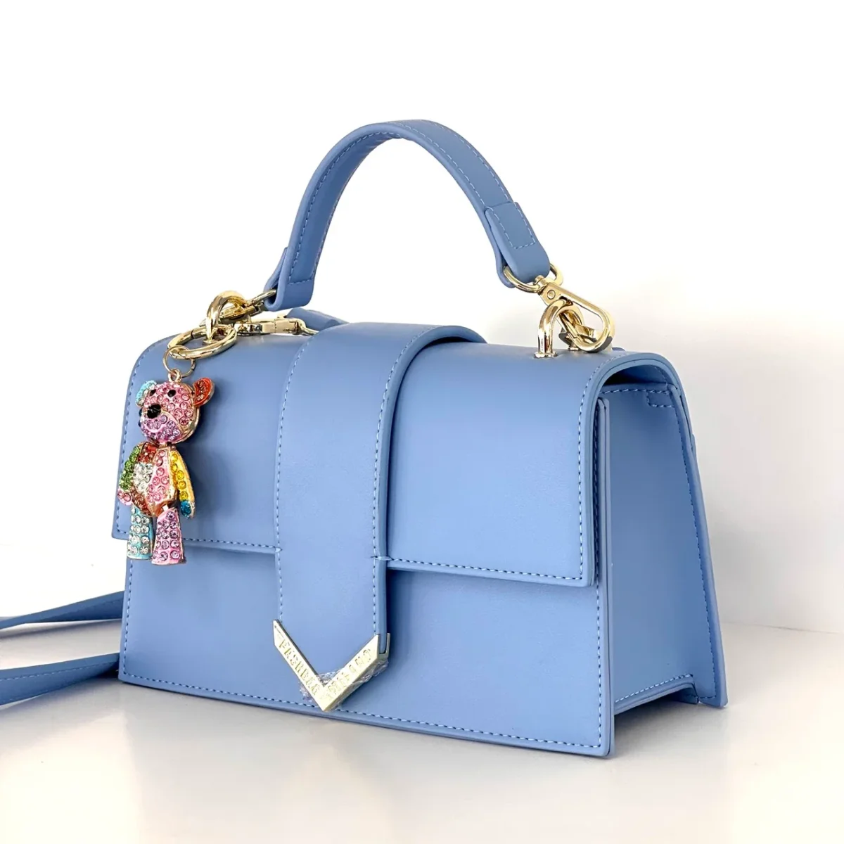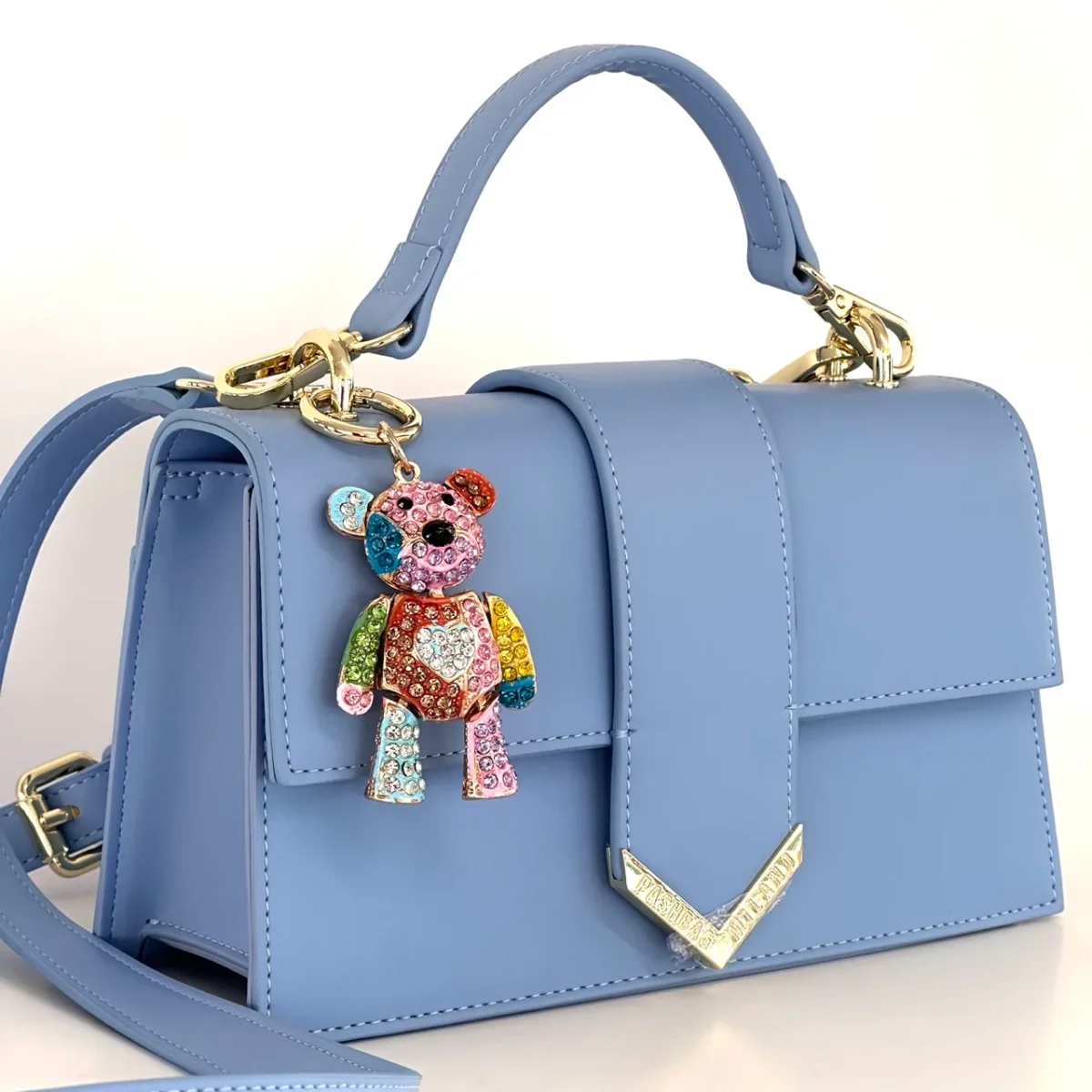 Borsa a mano Kayla di Pashbag, dall’allure contemporanea e adatta ad ogni esigenza. Portabilità a mano o a spalla. Realizzata in ecopelle è caratterizzata da un charm di brillantini colorati a forma di orsetto (sganciabile). Misure cm 22 x 12,5x 8 Chiusura con bottone magnetico, tracolla sganciabile e regolabile.