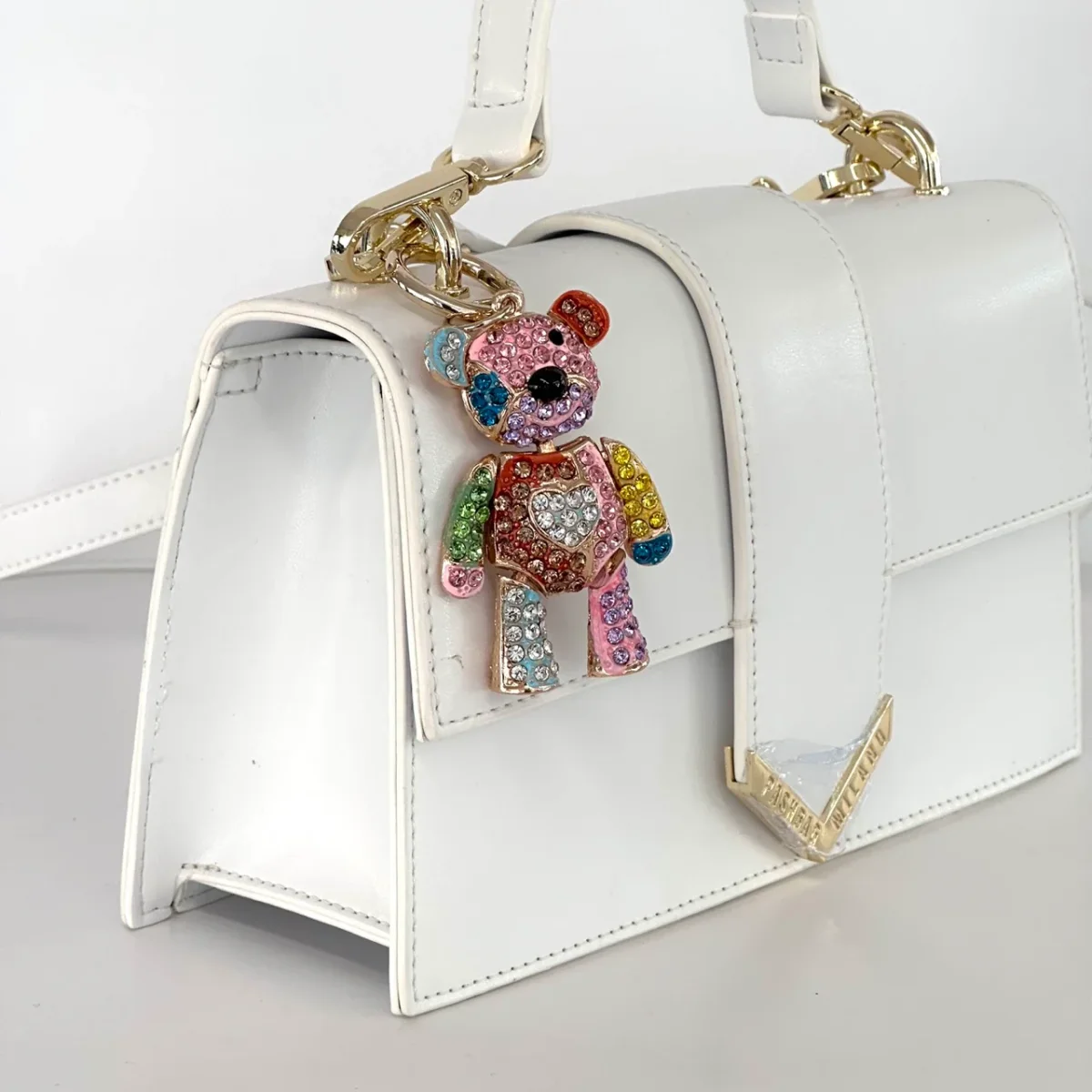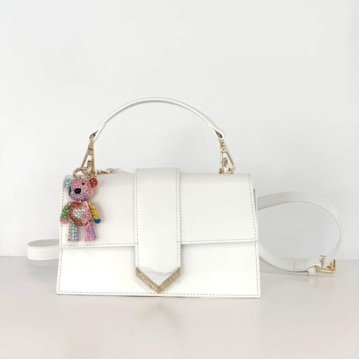 Borsa a mano Kayla di Pashbag, dall’allure contemporanea e adatta ad ogni esigenza. Portabilità a mano o a spalla. Realizzata in ecopelle è caratterizzata da un charm di brillantini colorati a forma di orsetto (sganciabile). Misure cm 22 x 12,5x 8 Chiusura con bottone magnetico, tracolla sganciabile e regolabile.