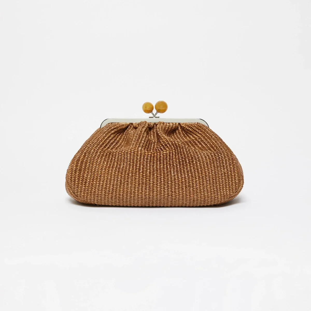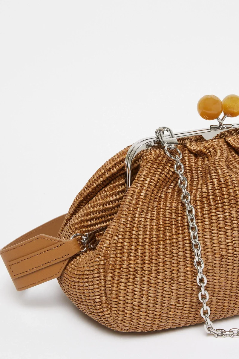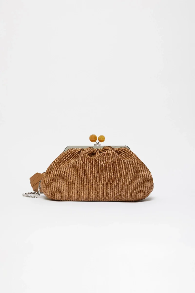 Pasticcino Bag medium, la super clutch per dare un tocco personale e affascinante al tuo stile quotidiano. Realizzata in tessuto effetto rafia e interno foderato in twill a righe con comoda tasca portaoggetti e label Weekend Max Mara. Dotata di una doppia tracolla rimovibile, in pelle e a catena con dettaglio in pelle, può essere indossata crossbody, a mano o sottospalla grazie al doppio attacco laterale e in testa. La sua forma destrutturata si adatta ad ogni tua esigenza. L’iconica chiusura clutch con boules è rifinita con logo a farfalla e logo Weekend Max Mara. Dimensioni: 31 x 13 x 21 cm.Composizione:52% cotone, 48% poliammide; fodera in 100%poliestere.
