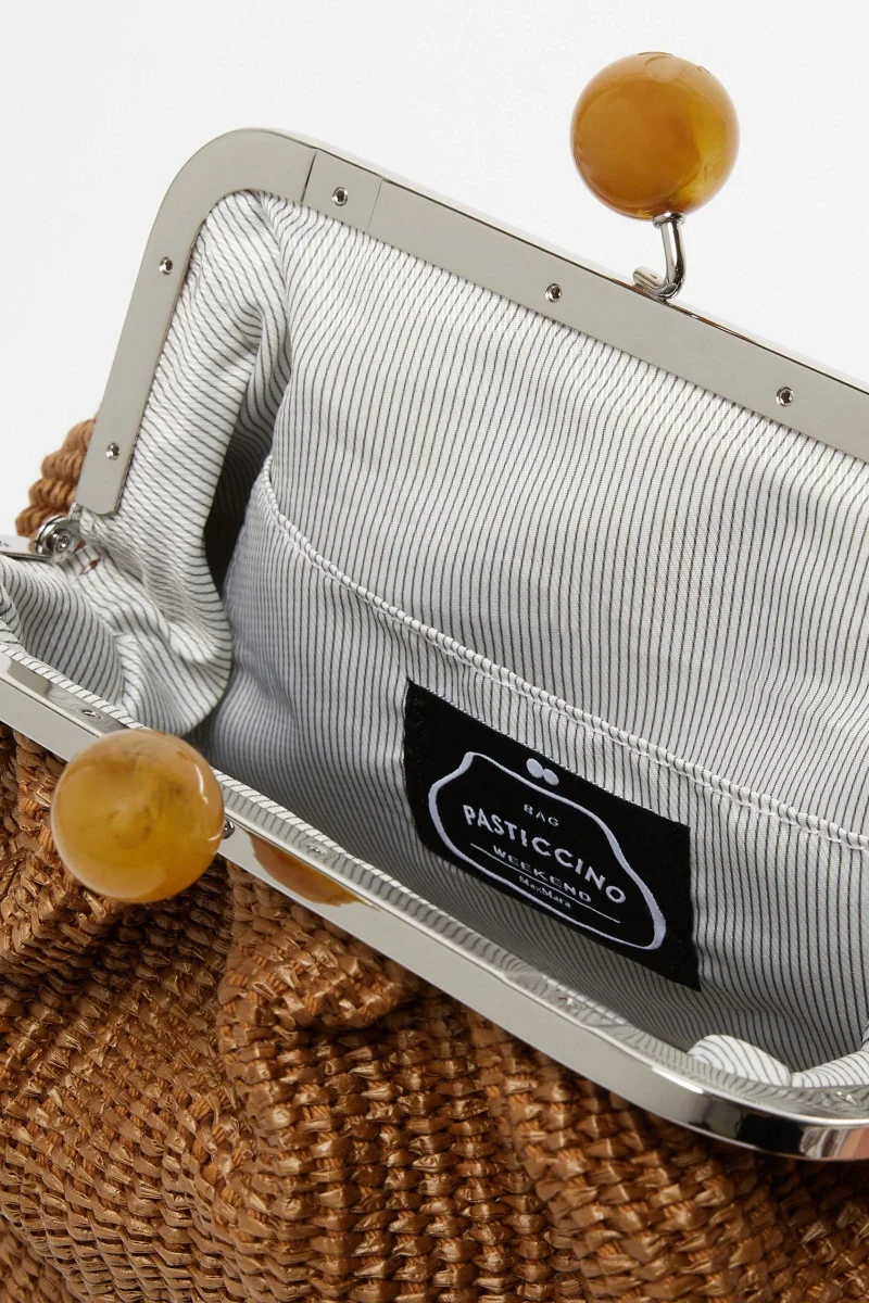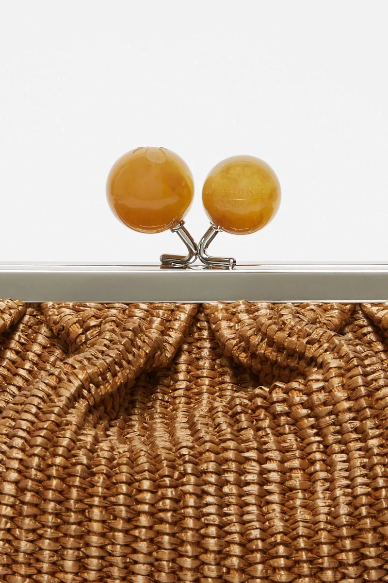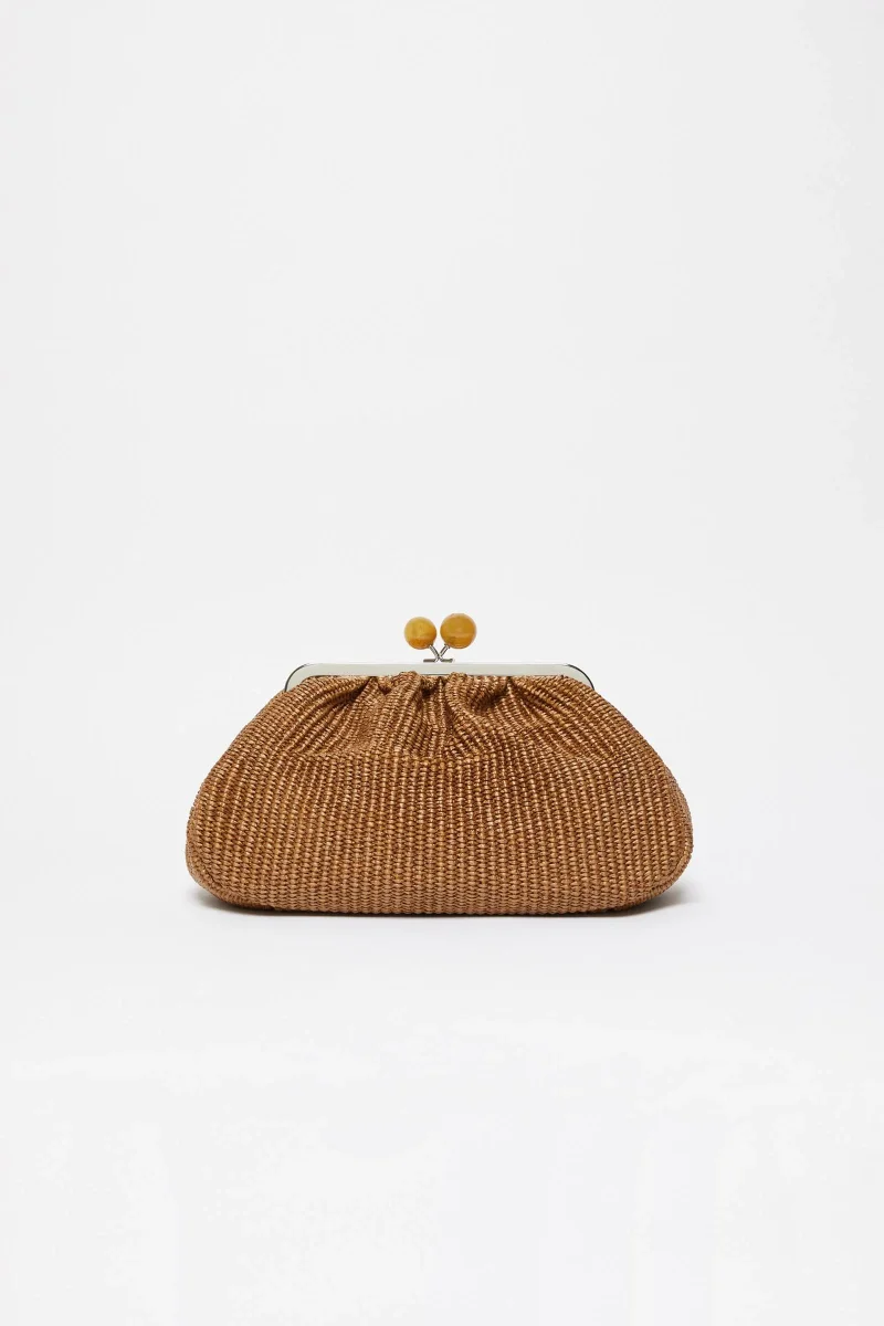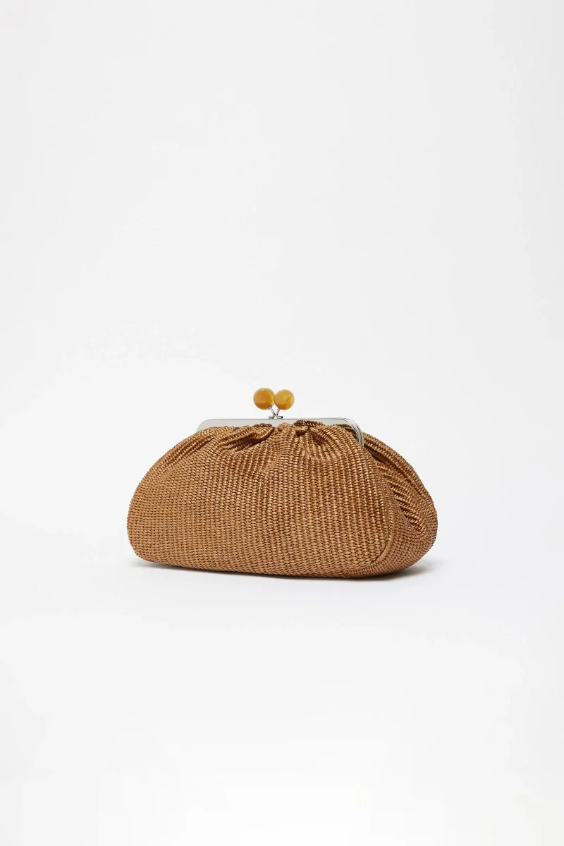 Pasticcino Bag medium, la super clutch per dare un tocco personale e affascinante al tuo stile quotidiano. Realizzata in tessuto effetto rafia e interno foderato in twill a righe con comoda tasca portaoggetti e label Weekend Max Mara. Dotata di una doppia tracolla rimovibile, in pelle e a catena con dettaglio in pelle, può essere indossata crossbody, a mano o sottospalla grazie al doppio attacco laterale e in testa. La sua forma destrutturata si adatta ad ogni tua esigenza. L’iconica chiusura clutch con boules è rifinita con logo a farfalla e logo Weekend Max Mara. Dimensioni: 31 x 13 x 21 cm.Composizione:52% cotone, 48% poliammide; fodera in 100%poliestere.