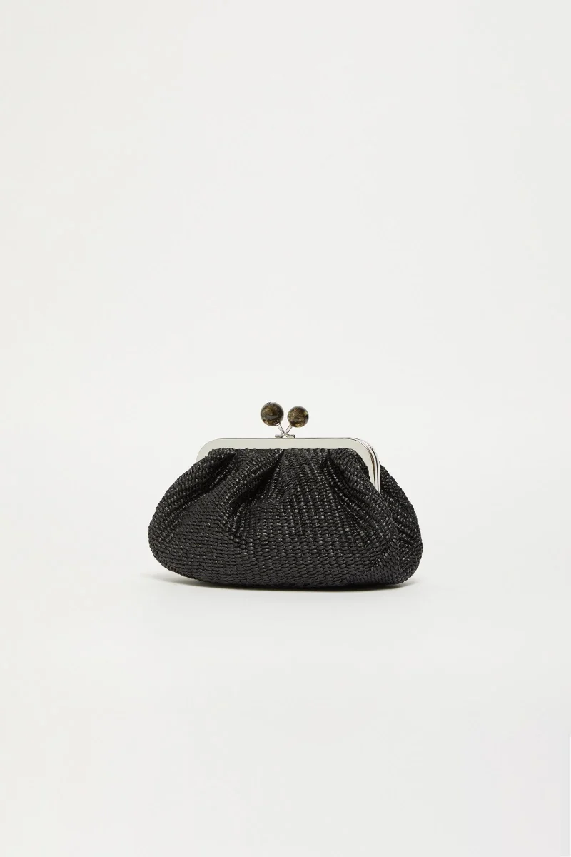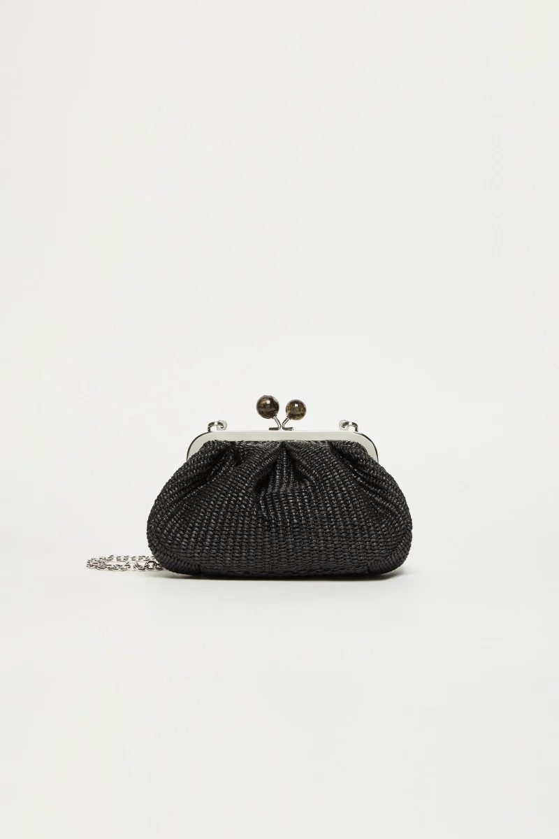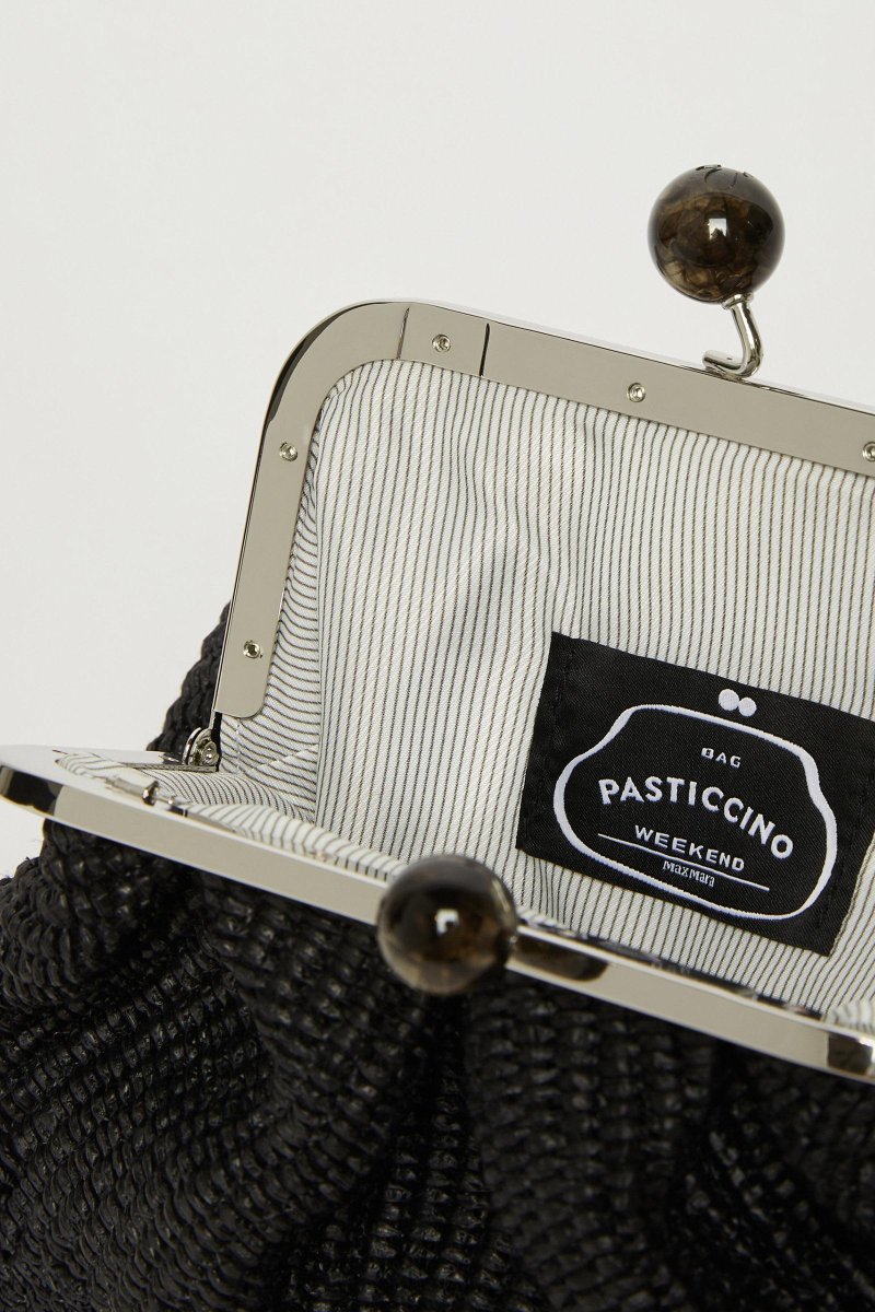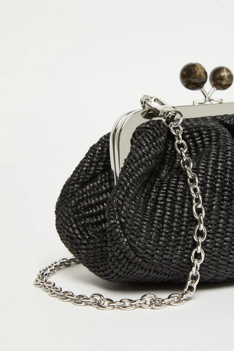 Pasticcino Bag small, la super clutch per dare un tocco personale e affascinante al tuo stile quotidiano. Realizzata in tessuto effetto rafia e interno foderato in twill a righe con comoda tasca portaoggetti e label Weekend Max Mara. La tracolla rimovibile a catena con spallaccio in pelle, permette di indossare la borsa crossbody o a mano grazie al doppio attacco laterale e in testa, per un outfit versatile e di tendenza. L’iconica chiusura clutch con boules è rifinita con logo a farfalla inciso e logo Weekend Max Mara. Dimensioni: 19 x 10 x 15 cm.Composizione:52% cotone, 48% poliammide; fodera in 100%poliestere.