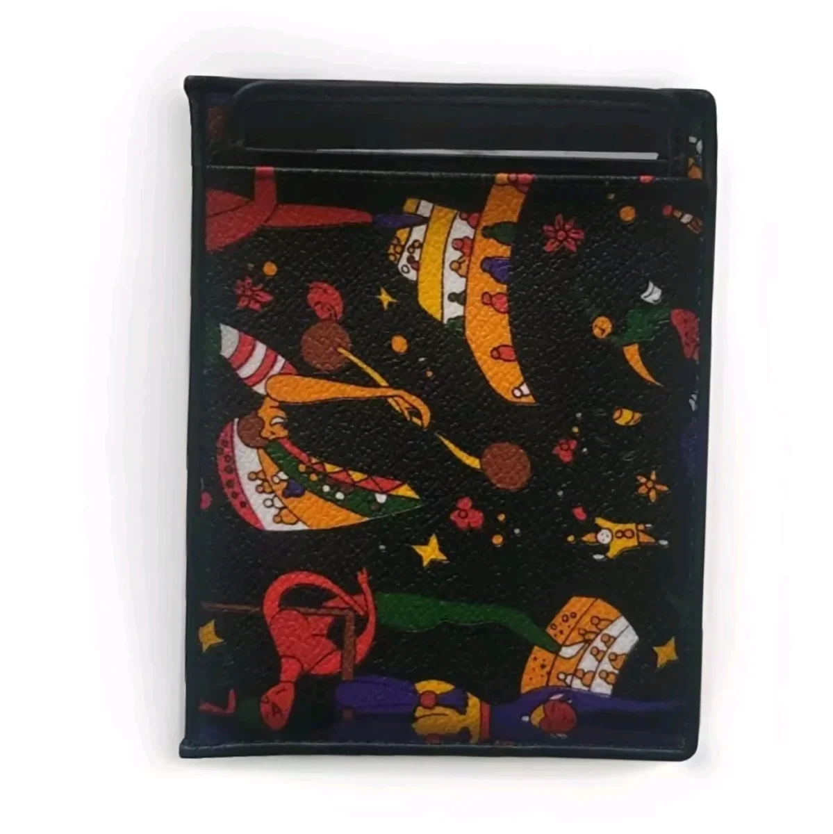 Porta carte e documenti realizzato in tessuto goffrato e pelle con fantasia magic Circus Porta carte di credito portadocumenti estraibile misure 13 × 10 cm Made in italy Non è possibile scegliere la fantasia ogni portafoglio è unico per garantire l’originalità