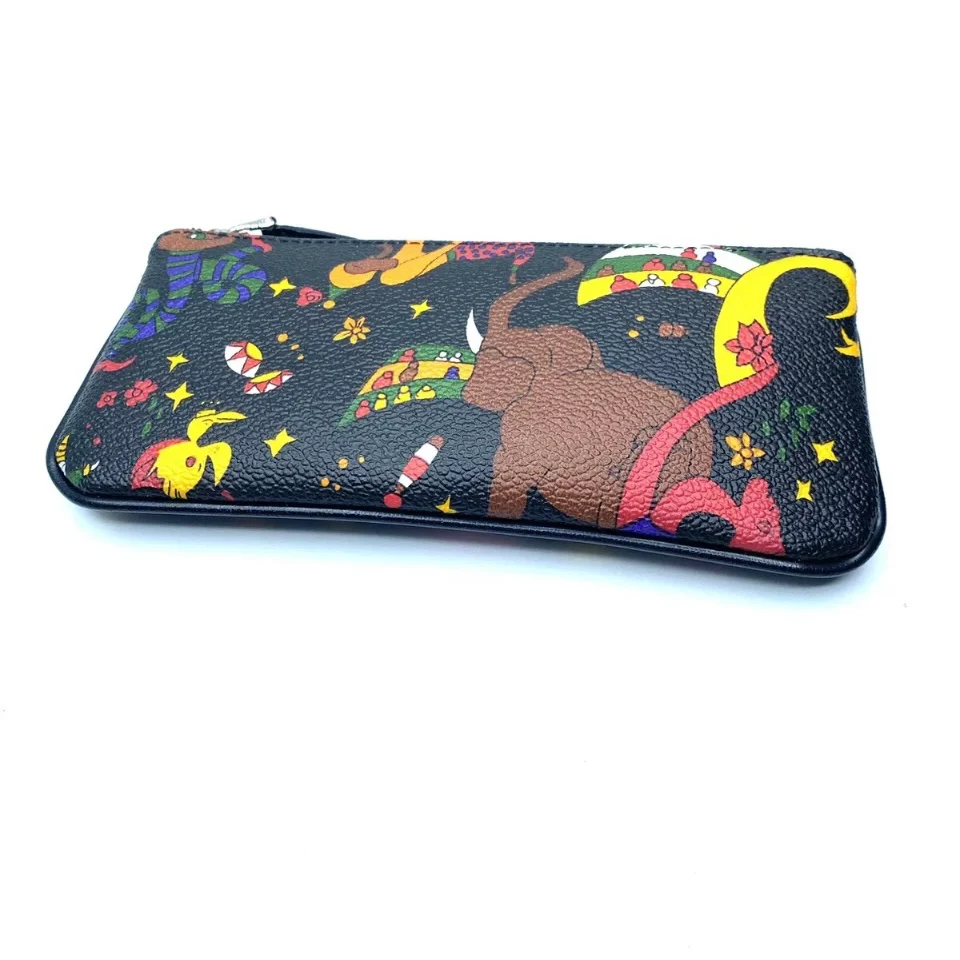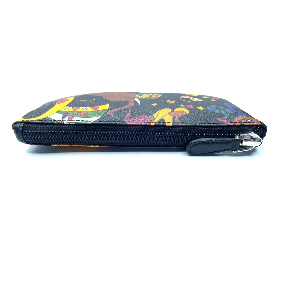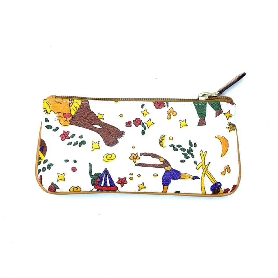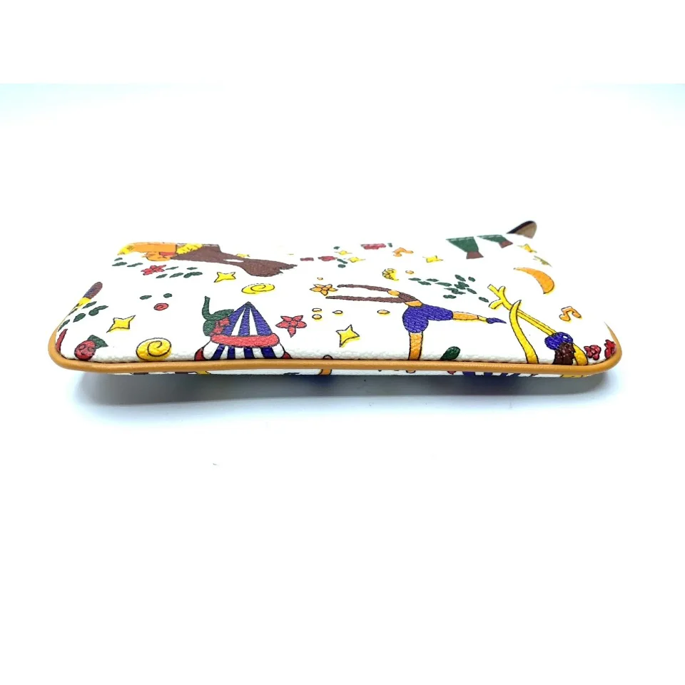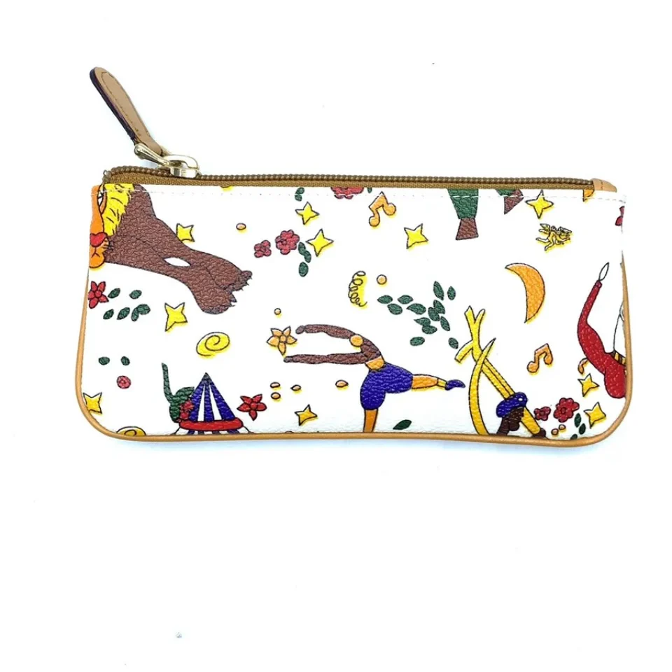Pochette magic circus realizzata in tessuto goffrato stampato con fantasia magic circus, finiture in metallo, riporti in cuoio, chiusura con zip misure 16,5 x 8 cm Made in italy