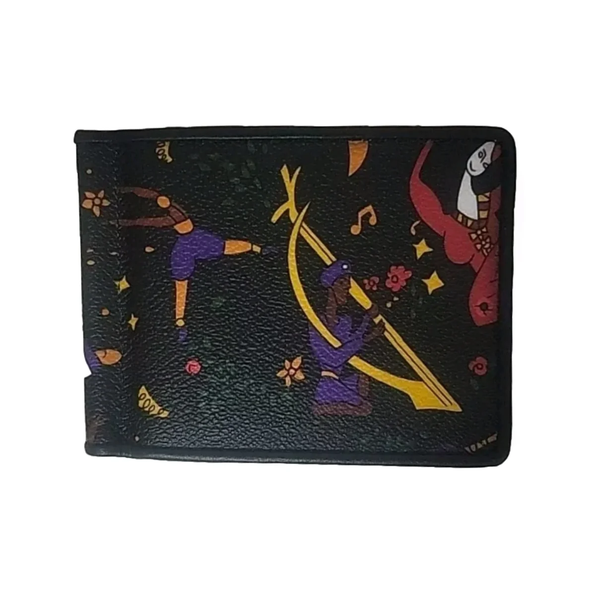 Portafoglio porta carte con molla per vanconote realizzato in tessuto goffrato e pelle con fantasia magic Circus nero.