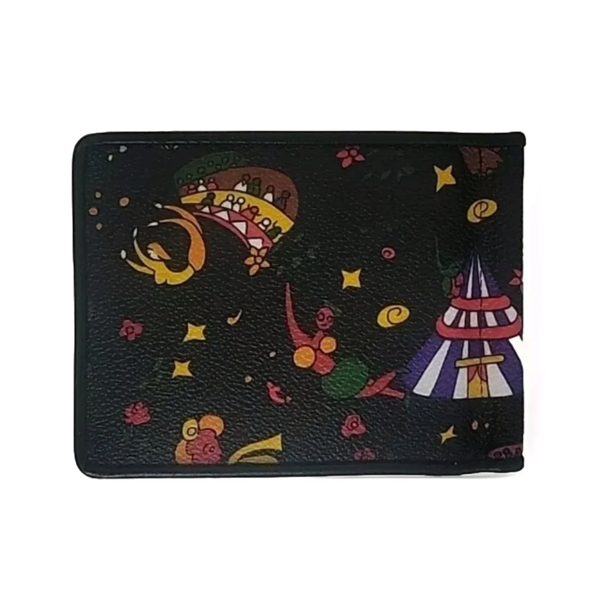 Portafoglio porta carte con molla per vanconote realizzato in tessuto goffrato e pelle con fantasia magic Circus nero. Misure 11,5 × 8,5 cm Made in italy