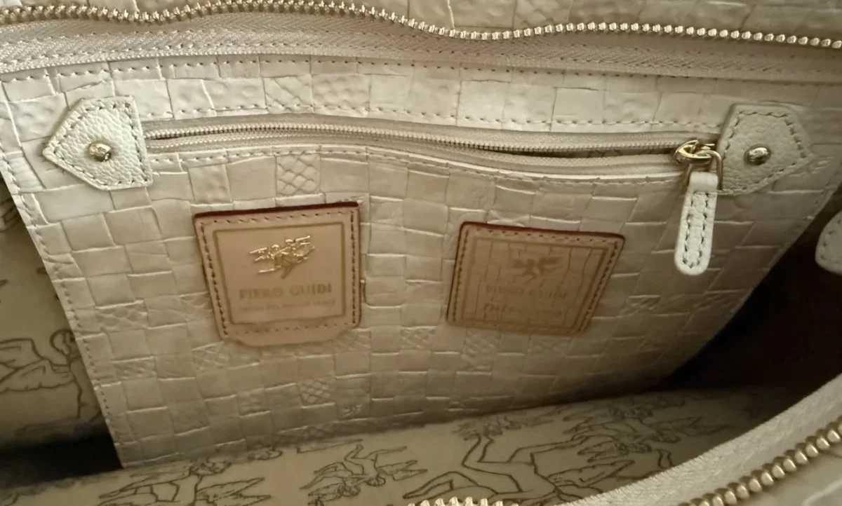 Piero Guidi Borsa a spalla realizzata in tessuto goffrato a rilievo con stampa intreccio, inserti in pelle. Borsa con un unico scomparto chiusa con doppia cerniera. Color panna » finiture in metallo dorato » riporti in cuoio » manico in cuoio » fodera interna stampata » ampia tasca interna chiusa con zip Borsa da indossare […]