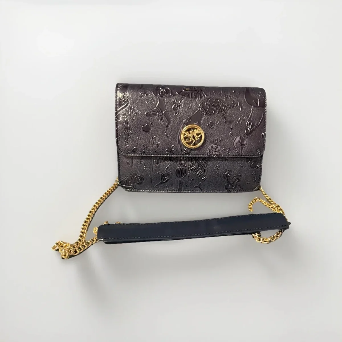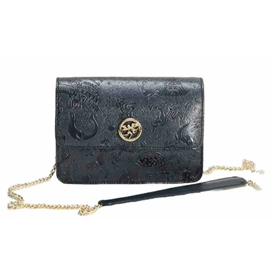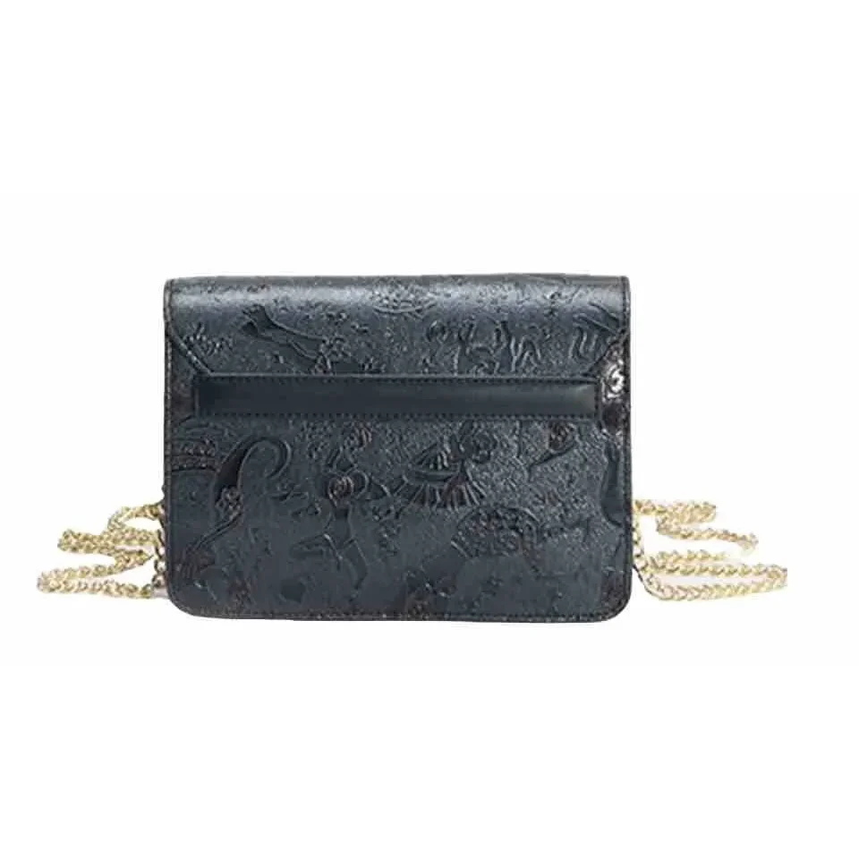 Articolo L17384070_14 realizzata in tessuto goffrato con stampa Magic Circus “Solid” Finiture in metallo dorato Riporti in cuoio Tracolla con catena Tasca interna Chiusura con pattina e bottone magnetico con logo Misure: 20,5×14,5×5 Made in Italy