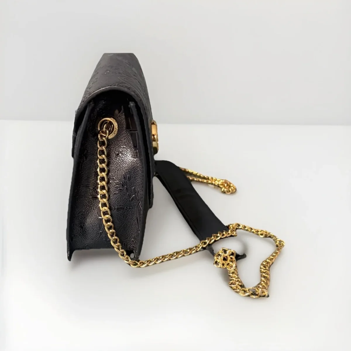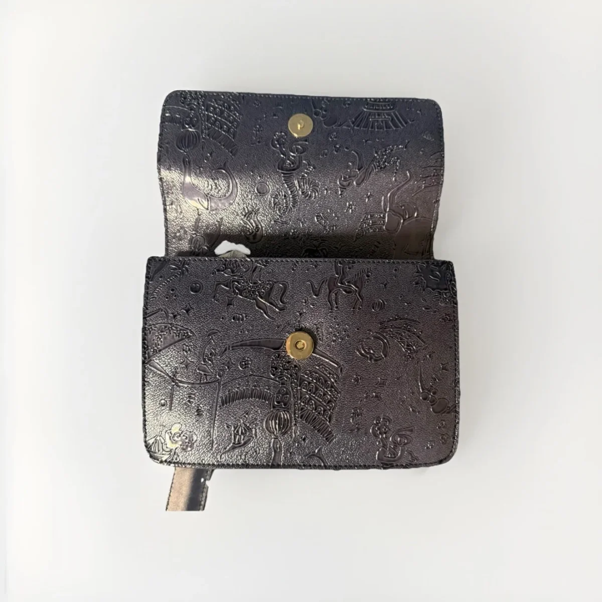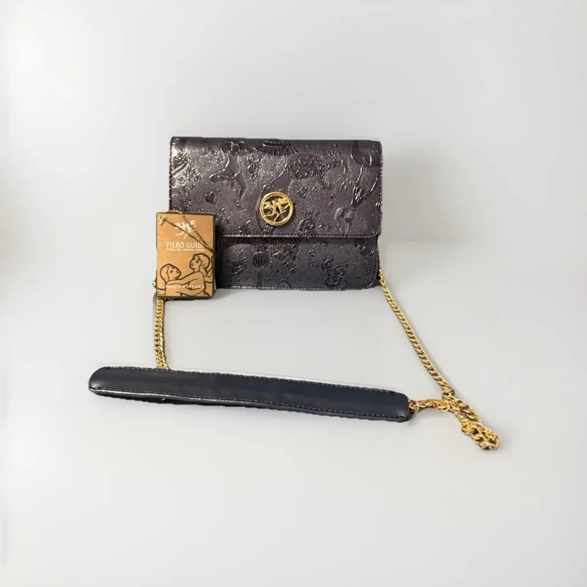 Articolo L17384070_14 realizzata in tessuto goffrato con stampa Magic Circus “Solid” Finiture in metallo dorato Riporti in cuoio Tracolla con catena Tasca interna Chiusura con pattina e bottone magnetico con logo Misure: 20,5×14,5×5 Made in Italy