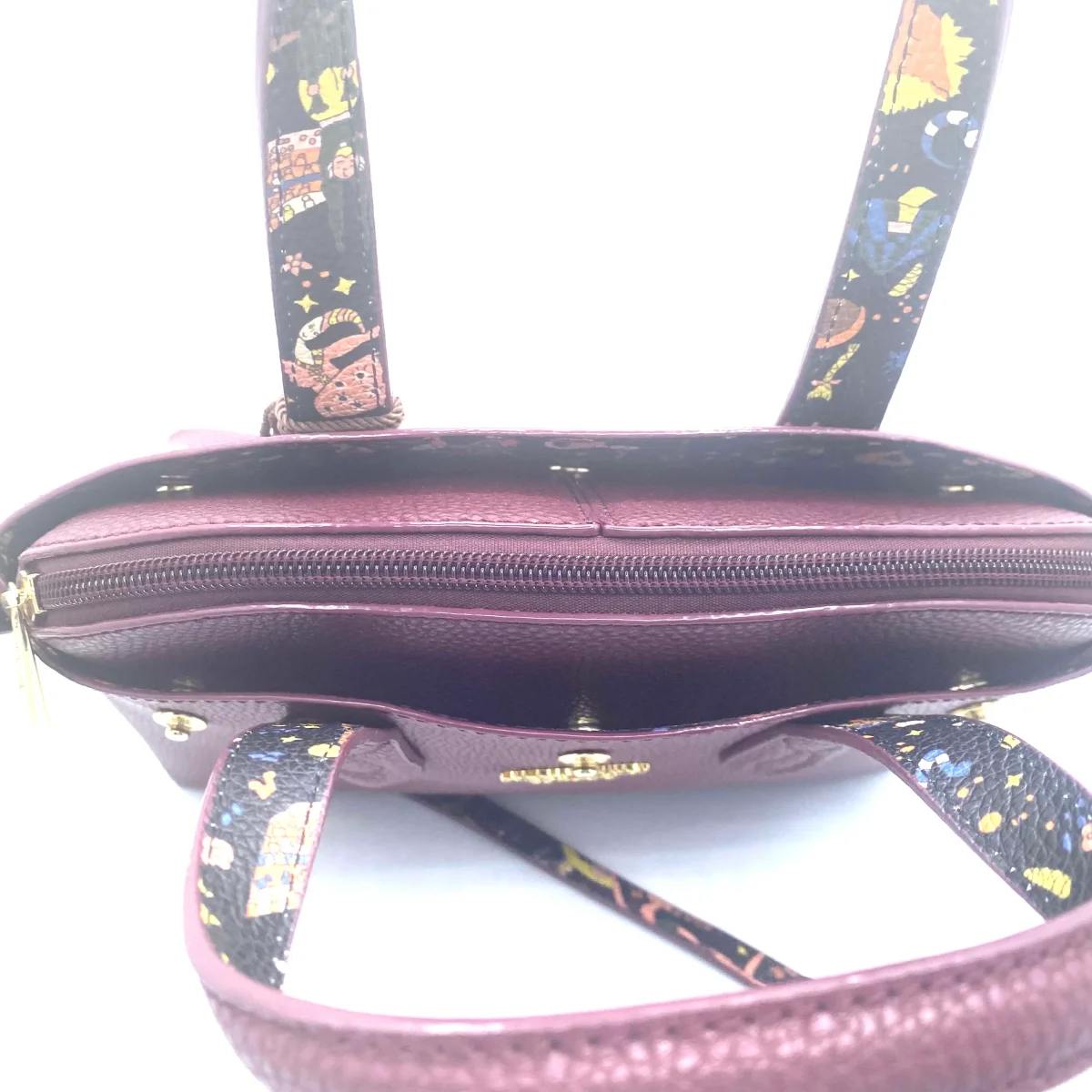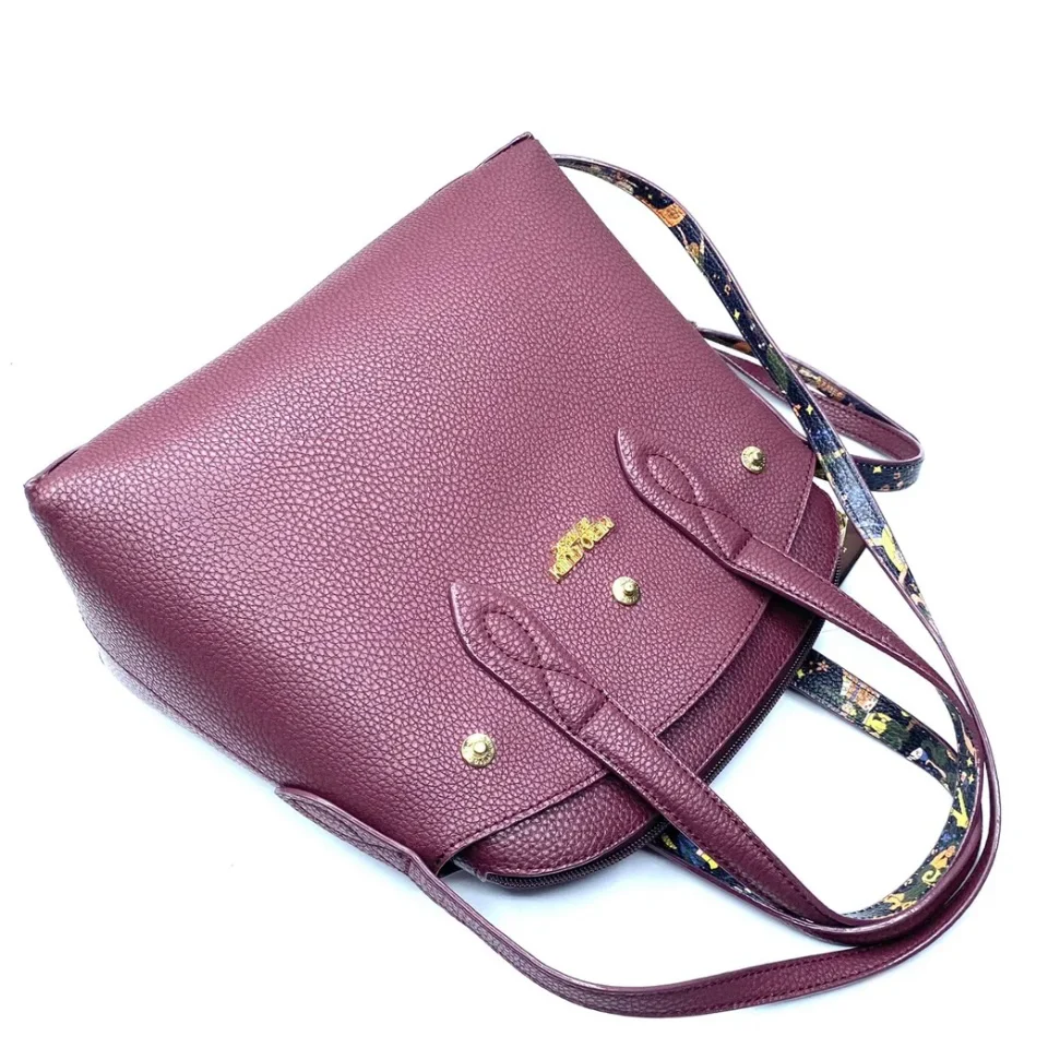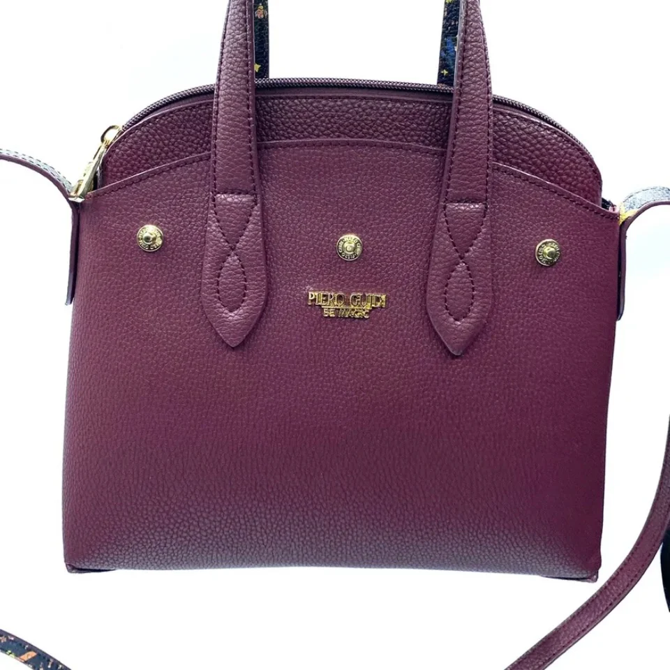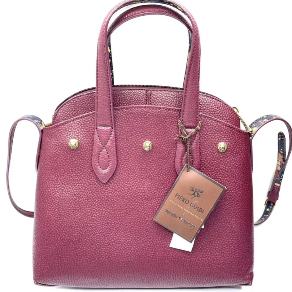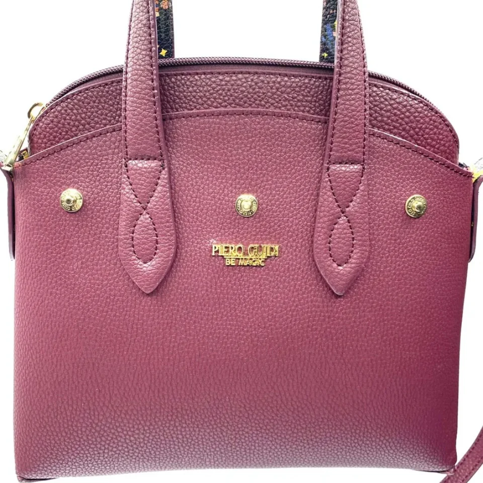 Borsa linea BE MAGIC realizzata in goffrato reversibile da una parte di color melanzana , dall’altra magic circus nera con doppi manici da portare a mano o a tracolla.finiture in metallo doratoParte superiore chiusa con bottoni a pressione staccabile Borsa chiusa con zip Misure: 27 x 24 x 13 cm Made in italy