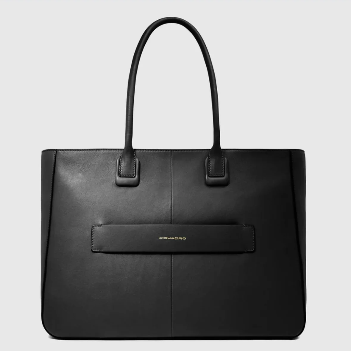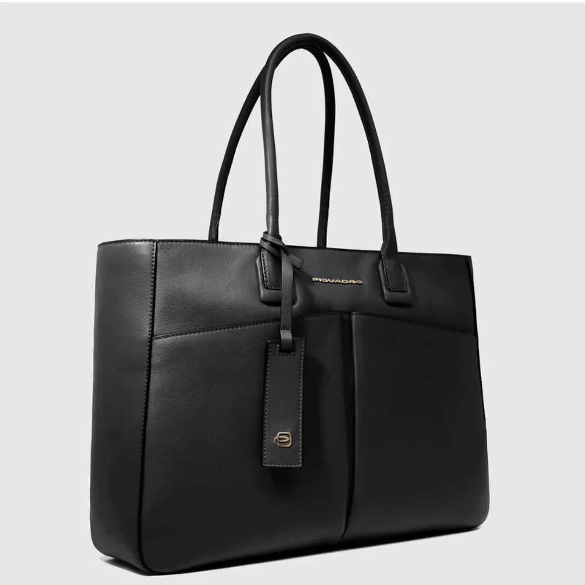 Piquadro shopping bag in pelle dotata di vano porta pc 14″ rinforzato anti urto. Ampio scomparto porta documenti, tasche ben organizzate.