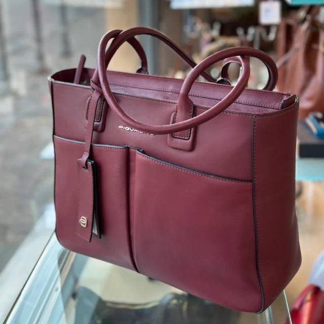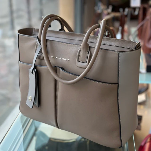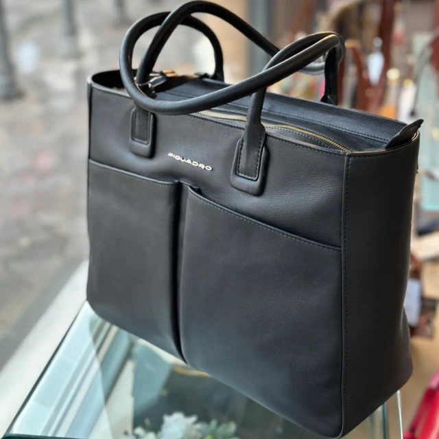 Piquadro shopping bag in pelle dotata di vano porta pc 14″ rinforzato anti urto. Ampio scomparto porta documenti, tasche ben organizzate.