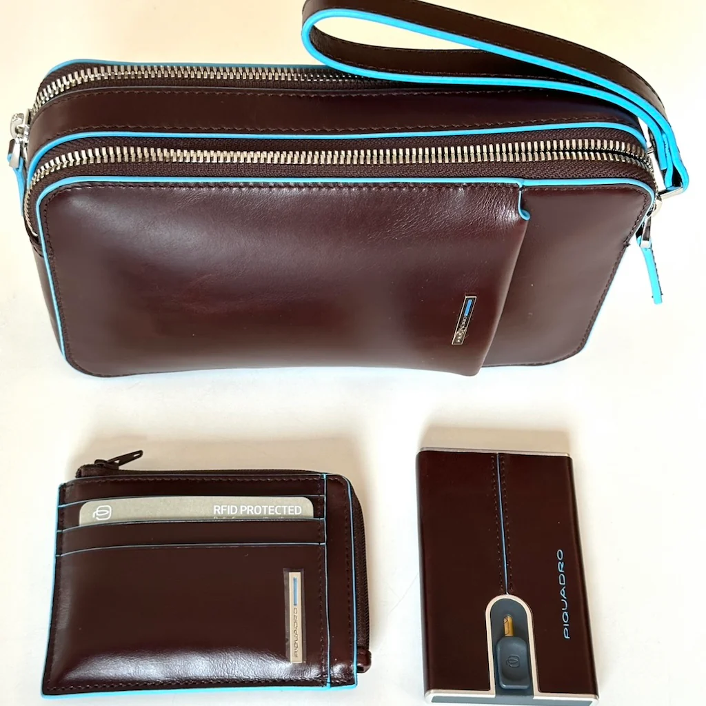 Pochette da uomo in pelle della linea Blue Square con il caratteristico bordo azzurro. Dotata di due scomparti, tasca frontale e polsiera amovibile.