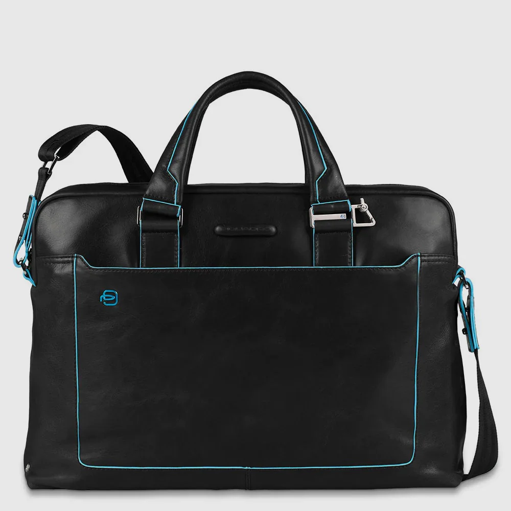 Piquadro cartella in pelle dal caratteristico profilo azzurro della linea Blue Square. Dotato di porta PC 14″, porta ombrello e porta bottiglia laterali. Organizzazione interna da ufficio. Tasca frontale chiusa con zip. Tracolla rimovibile. Codice prodotto CA3335B2 Colore: Nero