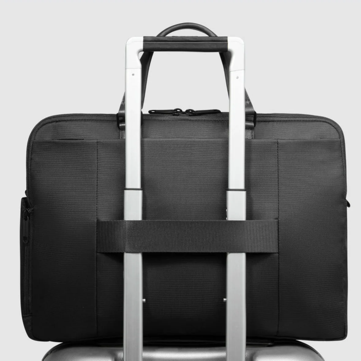 Sul retro, è dotata di un’ampia tasca con sistema di protezione RFID e del sistema di aggancio al trolley. Tasca laterale porta ombrello e porta pc. Tasche frontali chiuse con zip. Tracolla regolabile e amovibile.