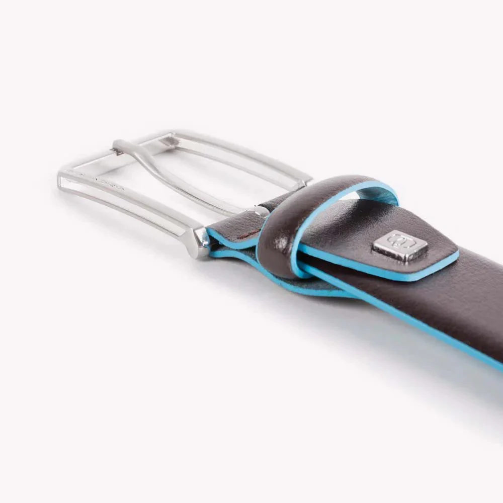 Cintura Piquadro da uomo in pelle colore mogano con bordi azzurri. Fibbia ad ardiglione. Misure: cm 125 x 3,5 x 0 (accorciabile)