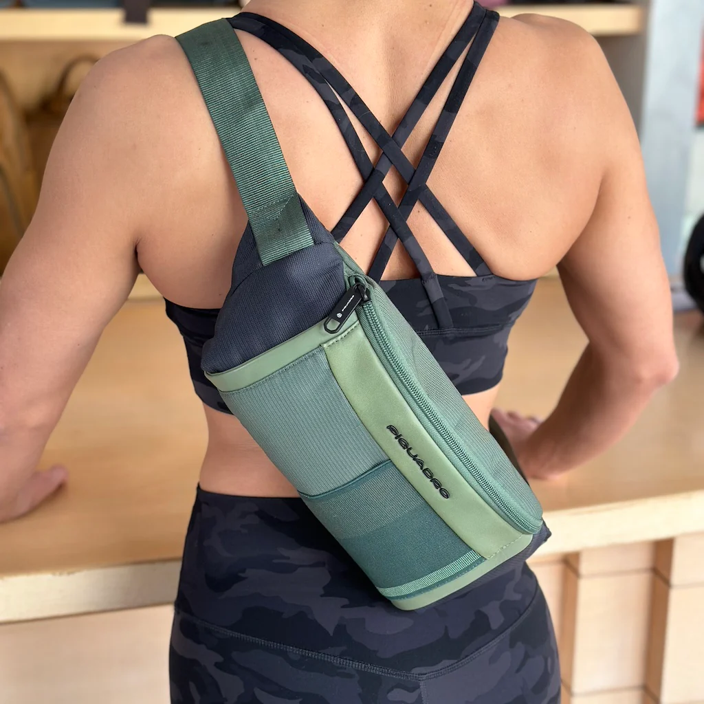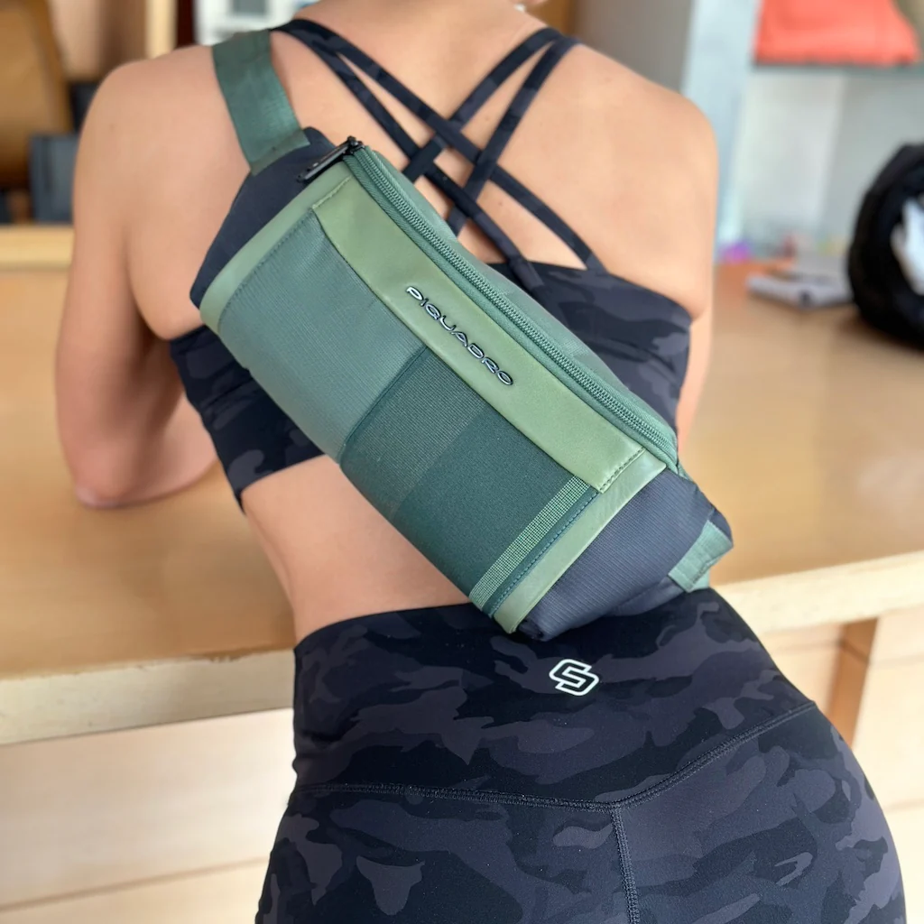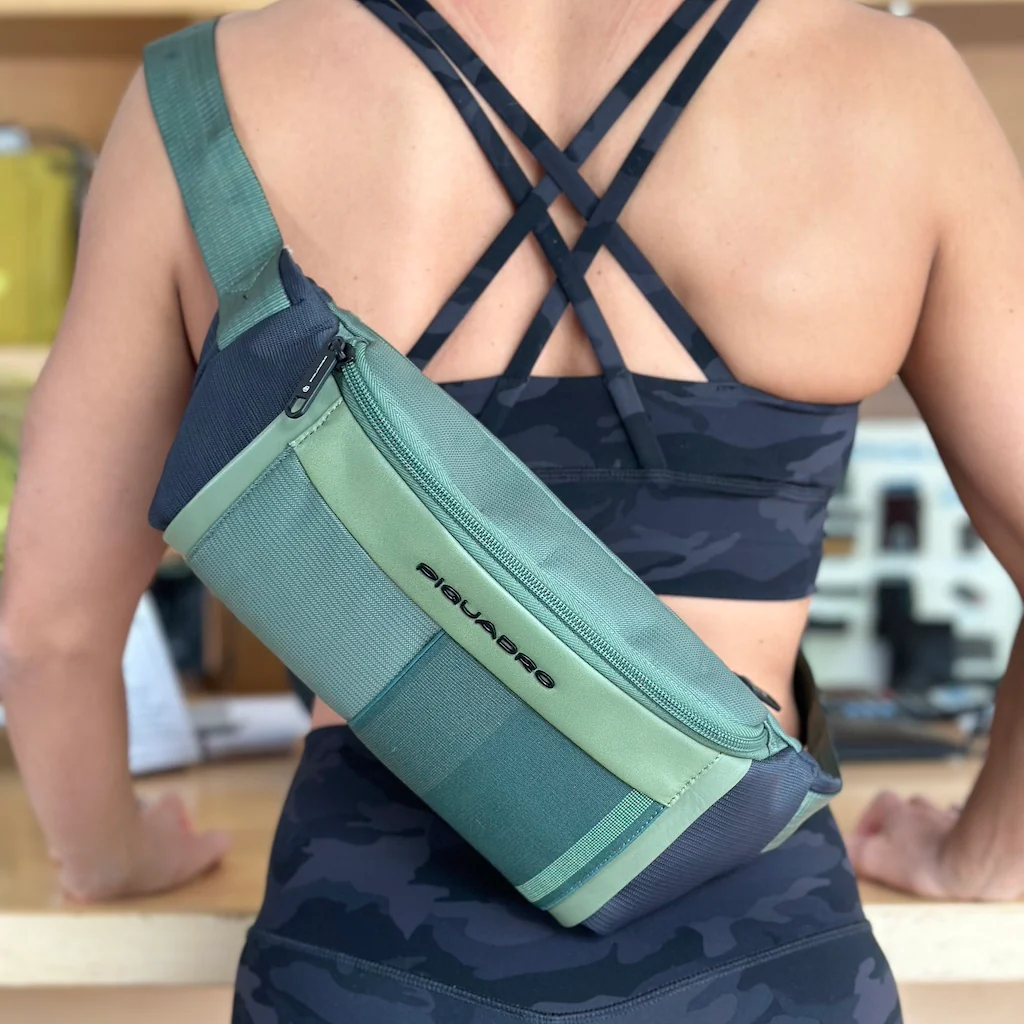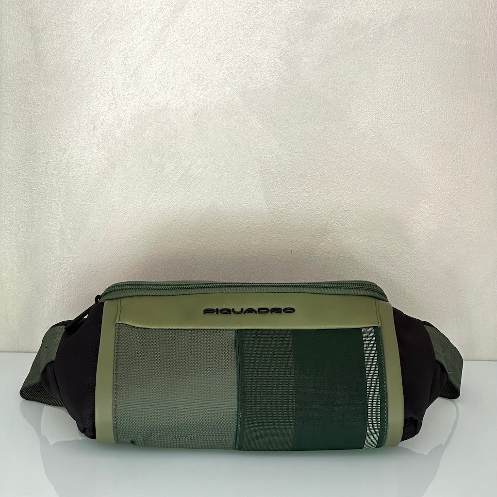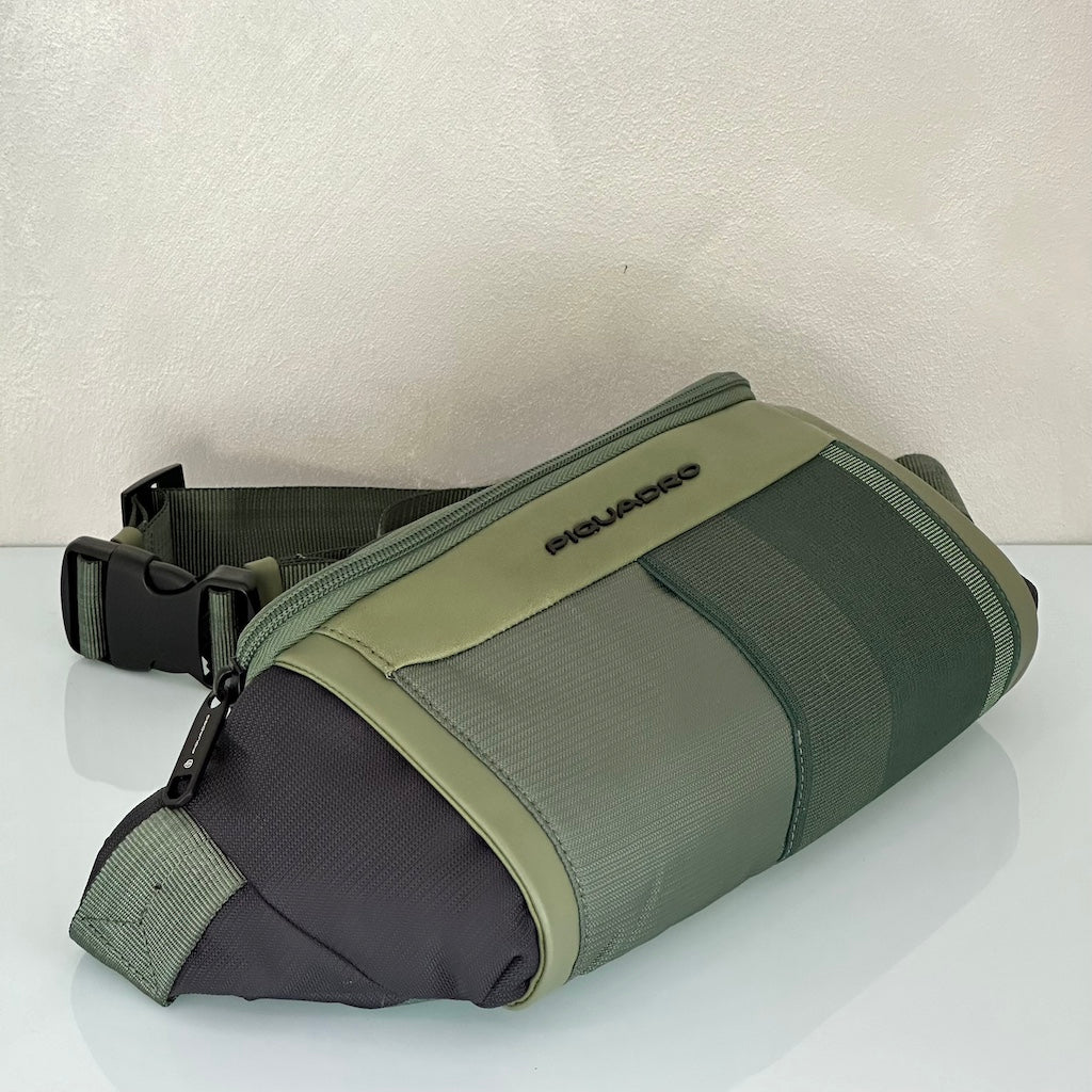 Marsupio Piquadro in tessuto con inserti in pelle. Tracolla larga cm 3,7 e regolabile.