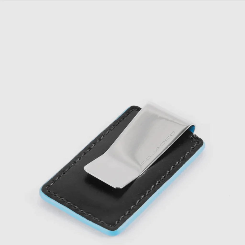 Fermsoldi in metallo e pelle con bordini azzurri.