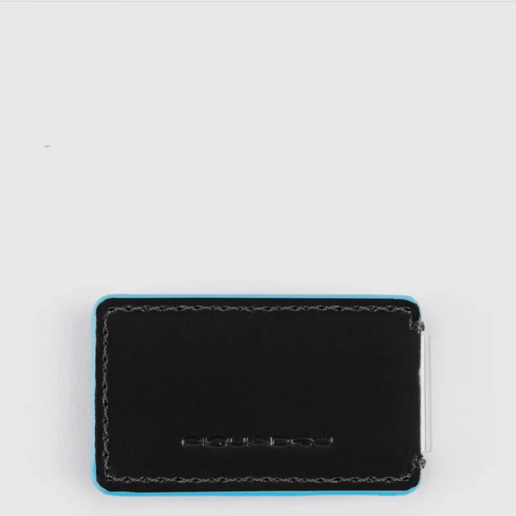 Fermsoldi in metallo e pelle con bordini azzurri. Misure cm 3,5 x 5,5 x 0,8 Peso: 14 gr Colore: Nero