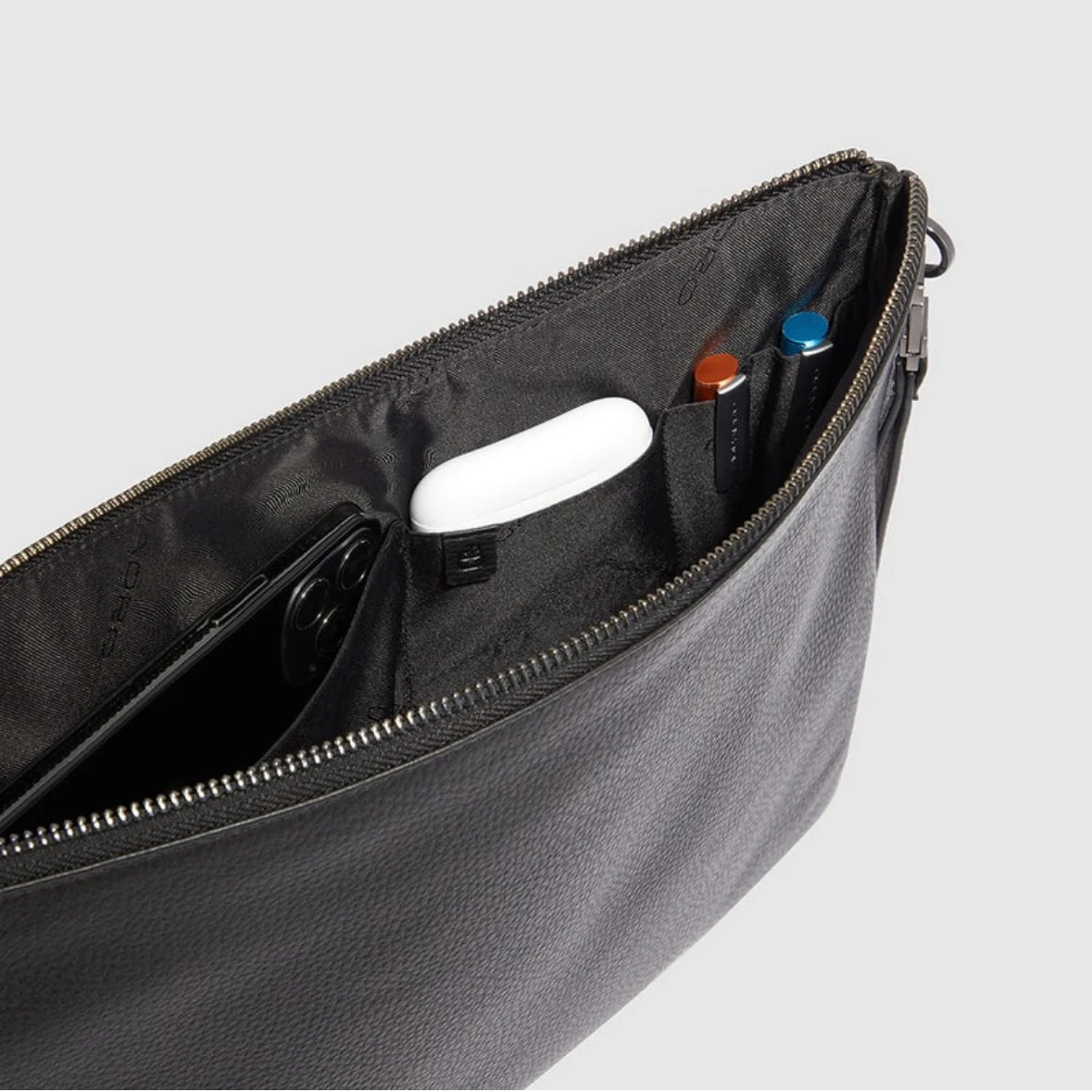 Pochette uomo per iPad Pro 12.9″ dotato di uno scomparto principale e di una tasca frontale. Interno foderato in tessuto nero, completo di vano imbottito anti urto e tasche porta oggetti.