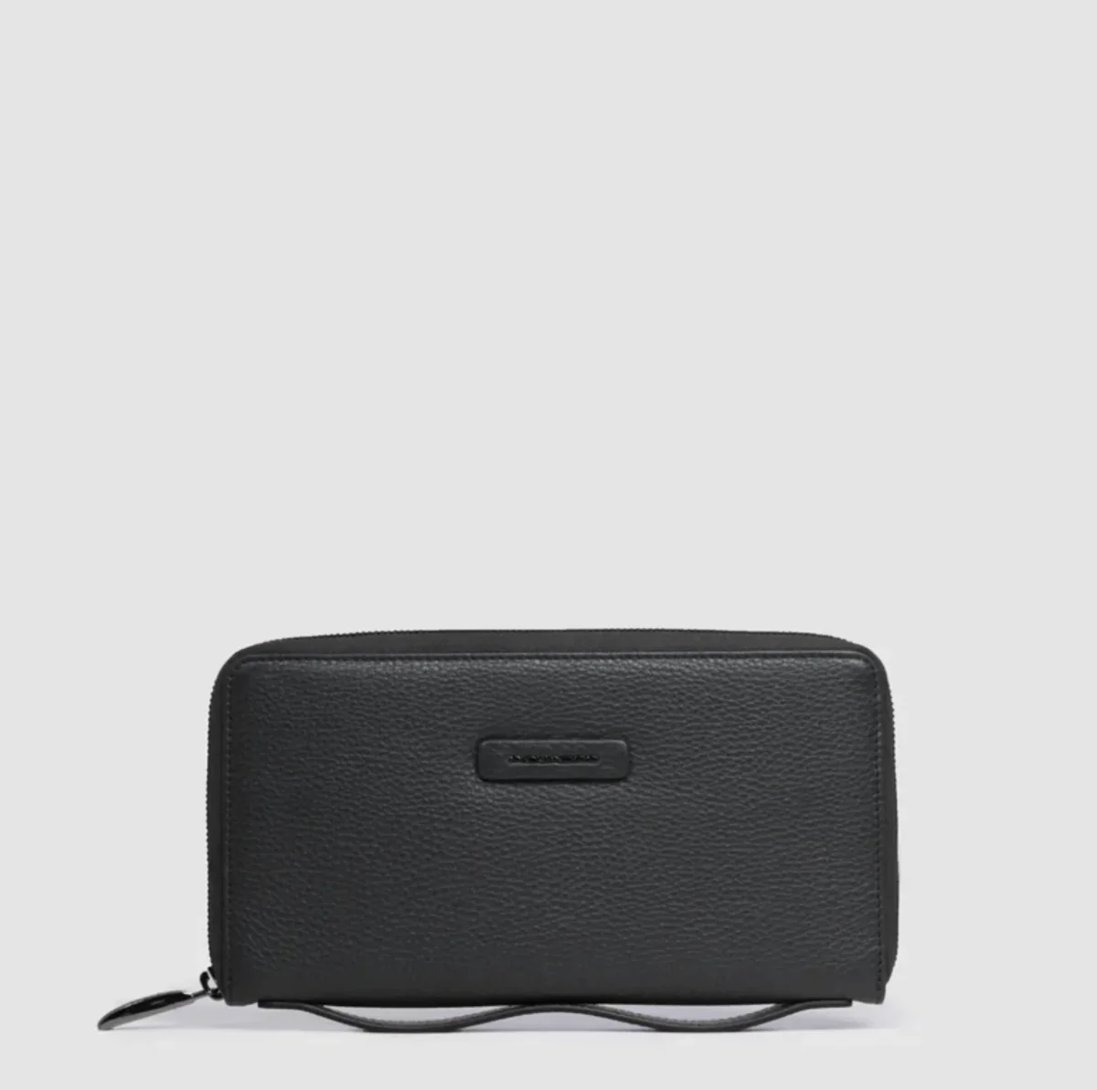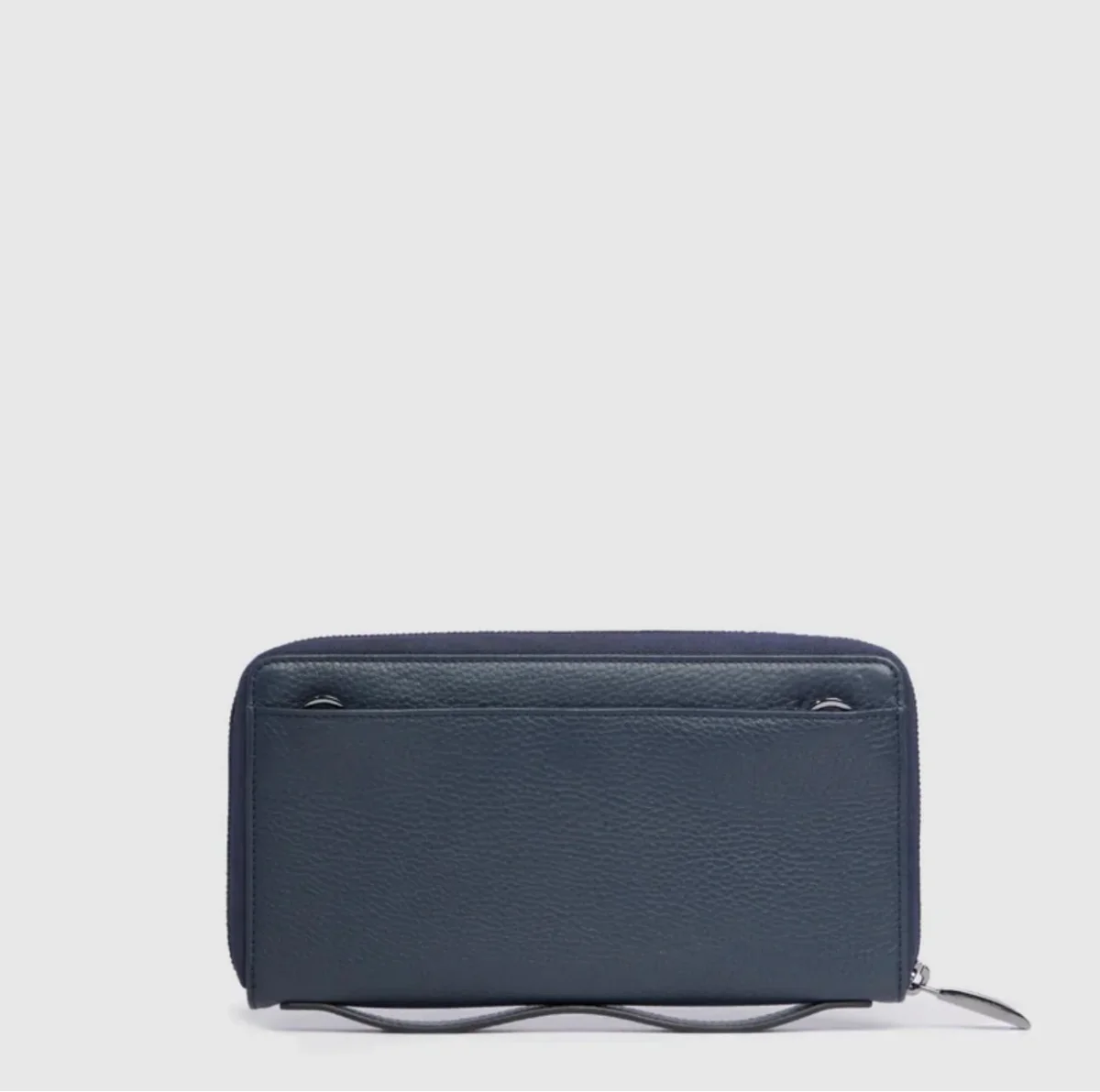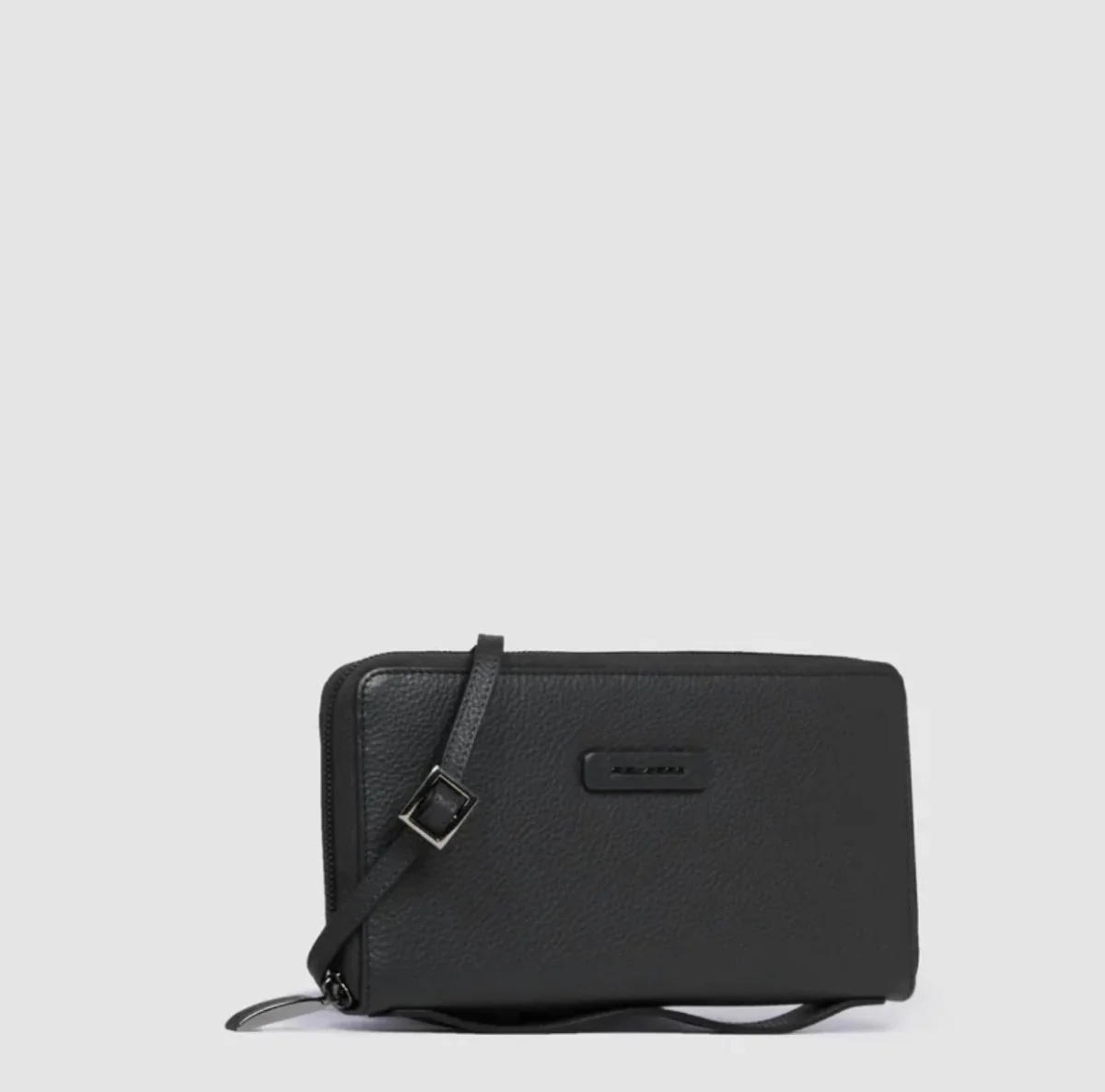 Da Piquadro, una busta in pelle sottile e funzionale. Chiusa con zip e dotata di una tracollina in pelle staccabile. Organizzata in tre scomparti, completa di zip porta monete e n.9 fessure porta tessere. Sistema di protezione RFID.