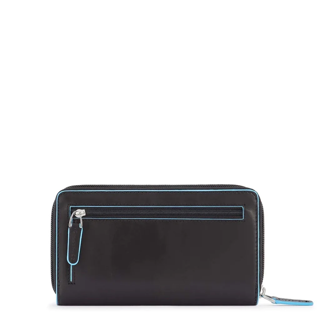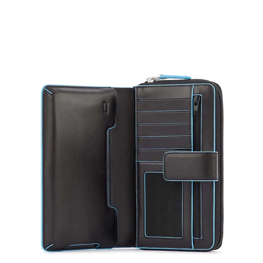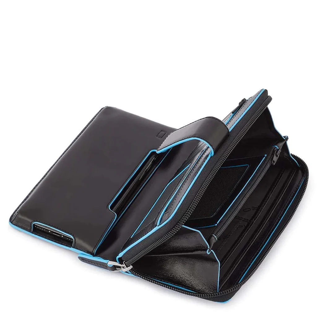 Piquadro portafoglio donna in pelle linea Blue Square. Dotato di portamonete, porta documenti e 12 fessure porta carte di credito. Tasca porta smartphone.
