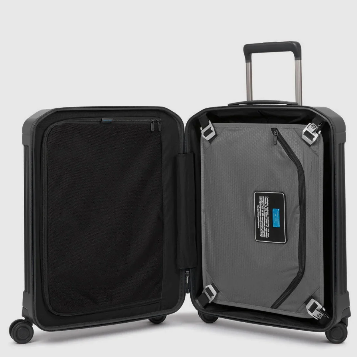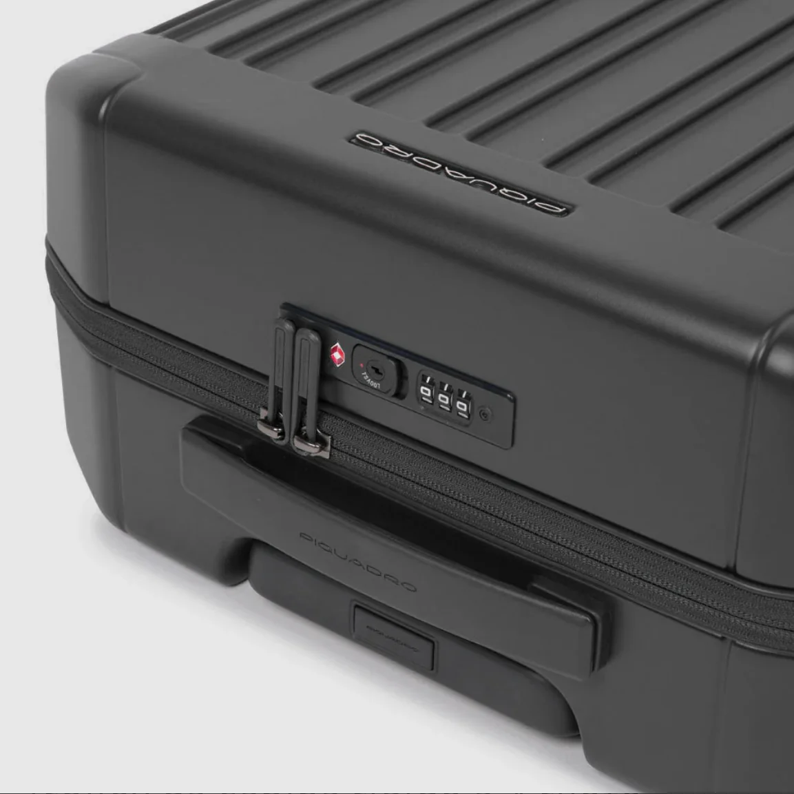 Piquadro, Trolley da cabina a 4 ruote con chiusura con combinazione, chiusura TSA, porta USB e USB type C. Fodera interna rimovibile e lavabile.