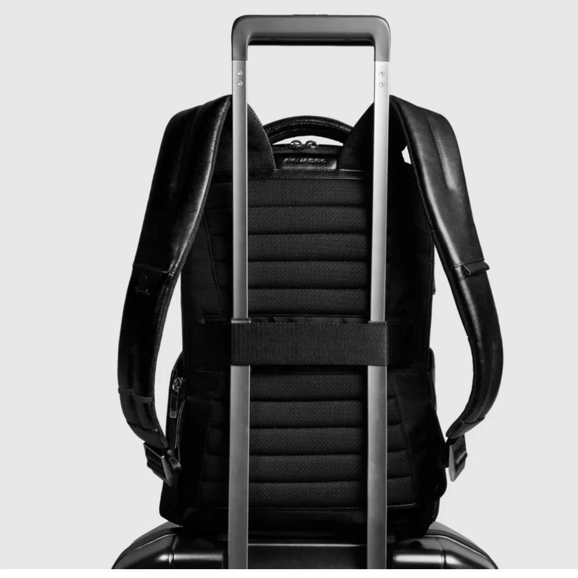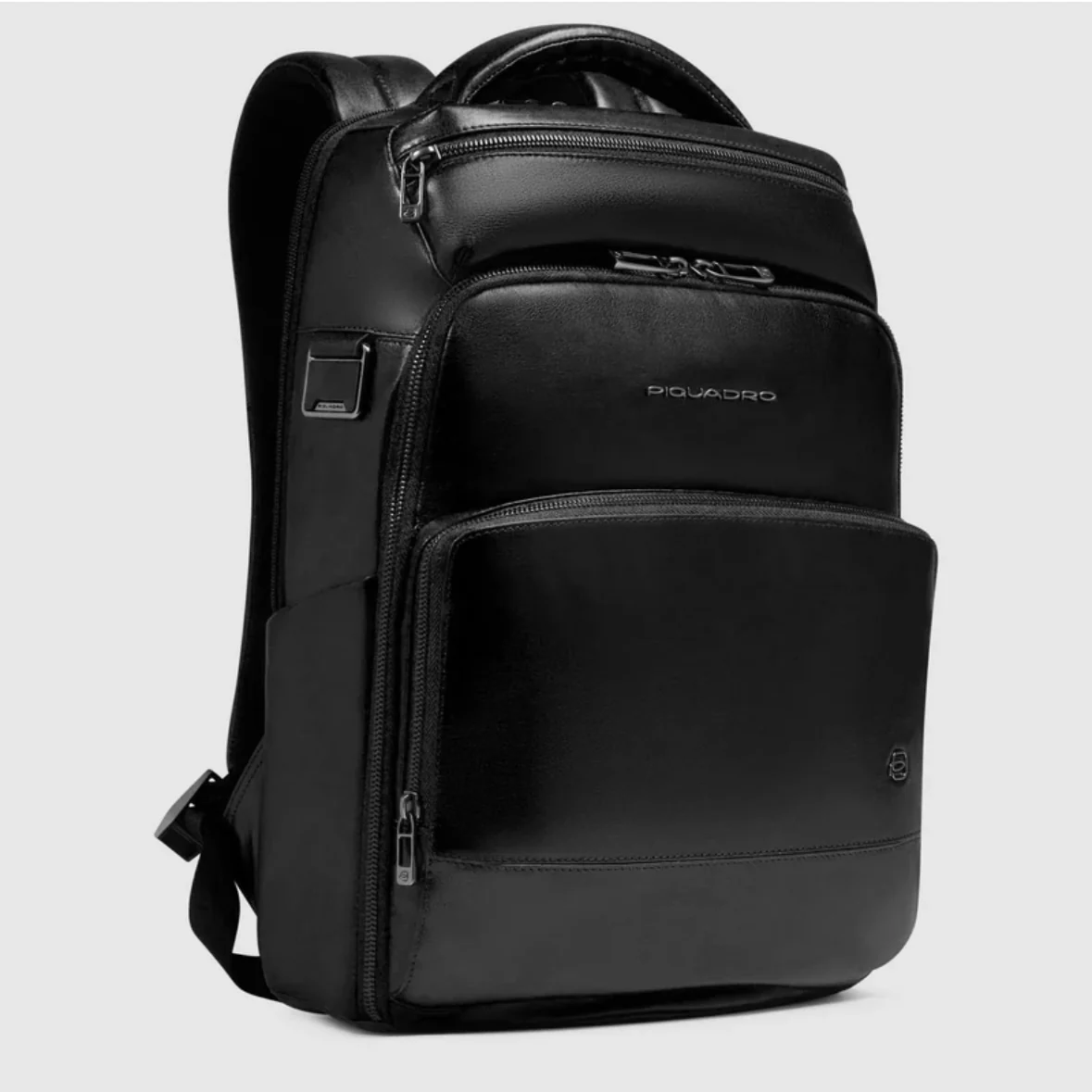 Piquadro zaino in pelle con porta PC 14″ e porta iPad rinforzati anti urto. Dotato di cinghia esternale, portaocchiali e protezione RFID.