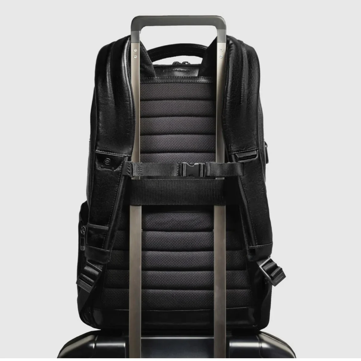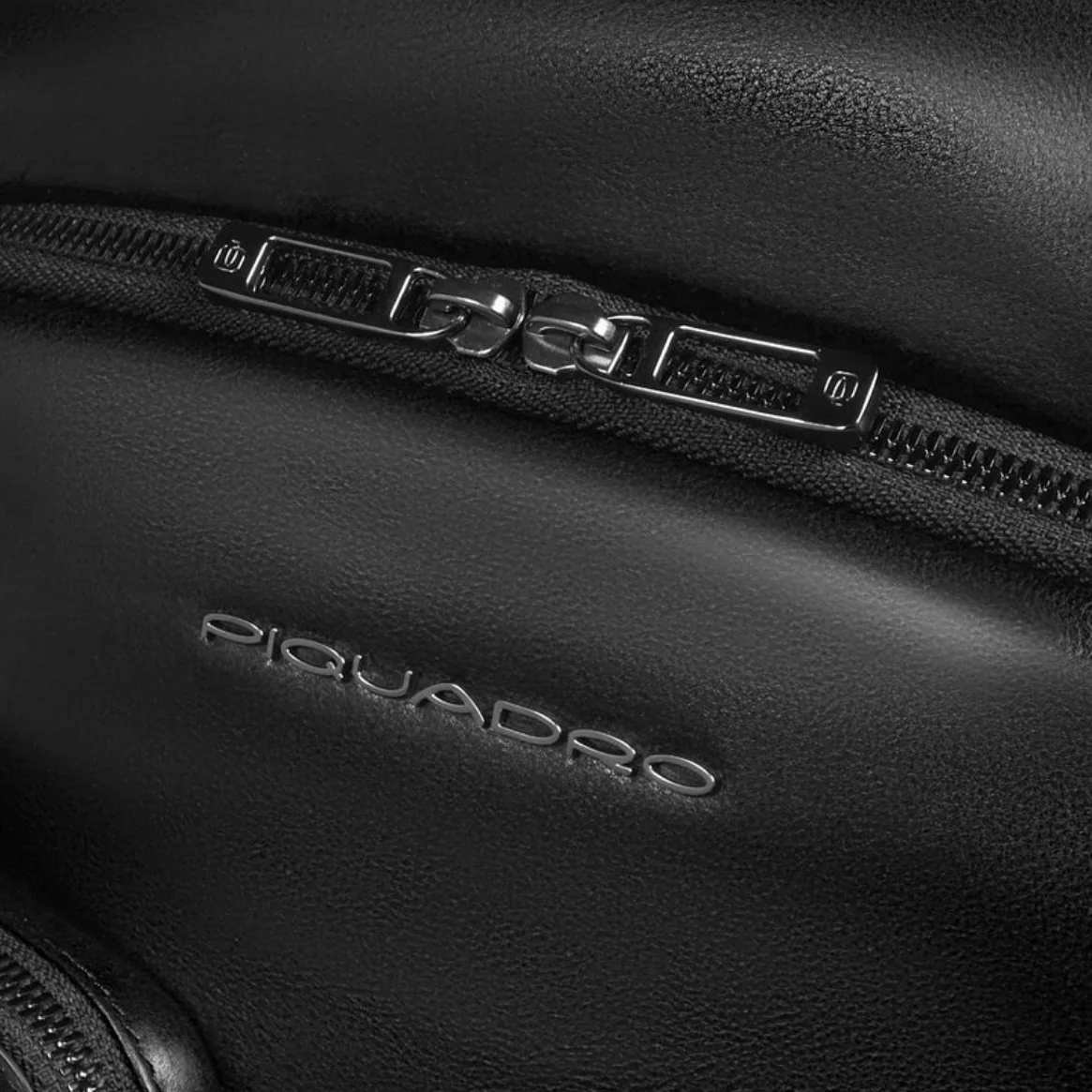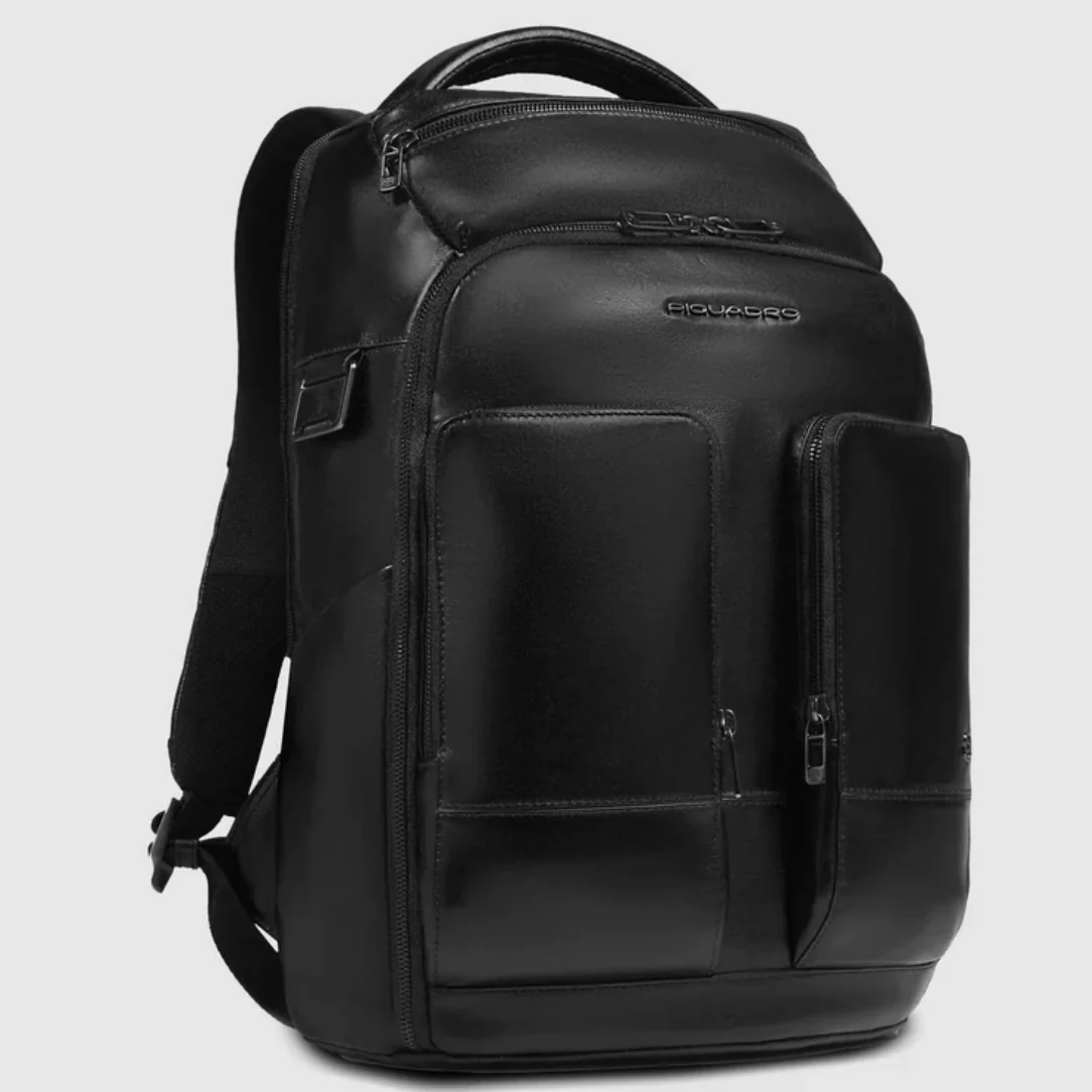 Piquadro zaino in pelle con porta PC 15,6″ e porta iPad rinforzati anti urto. Dotato di cinghia esternale, portaocchiali e protezione RFID.