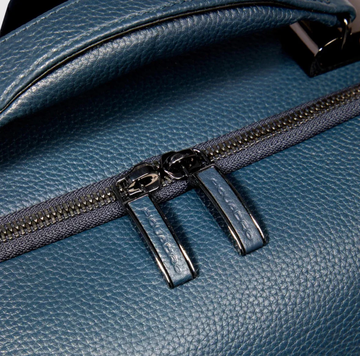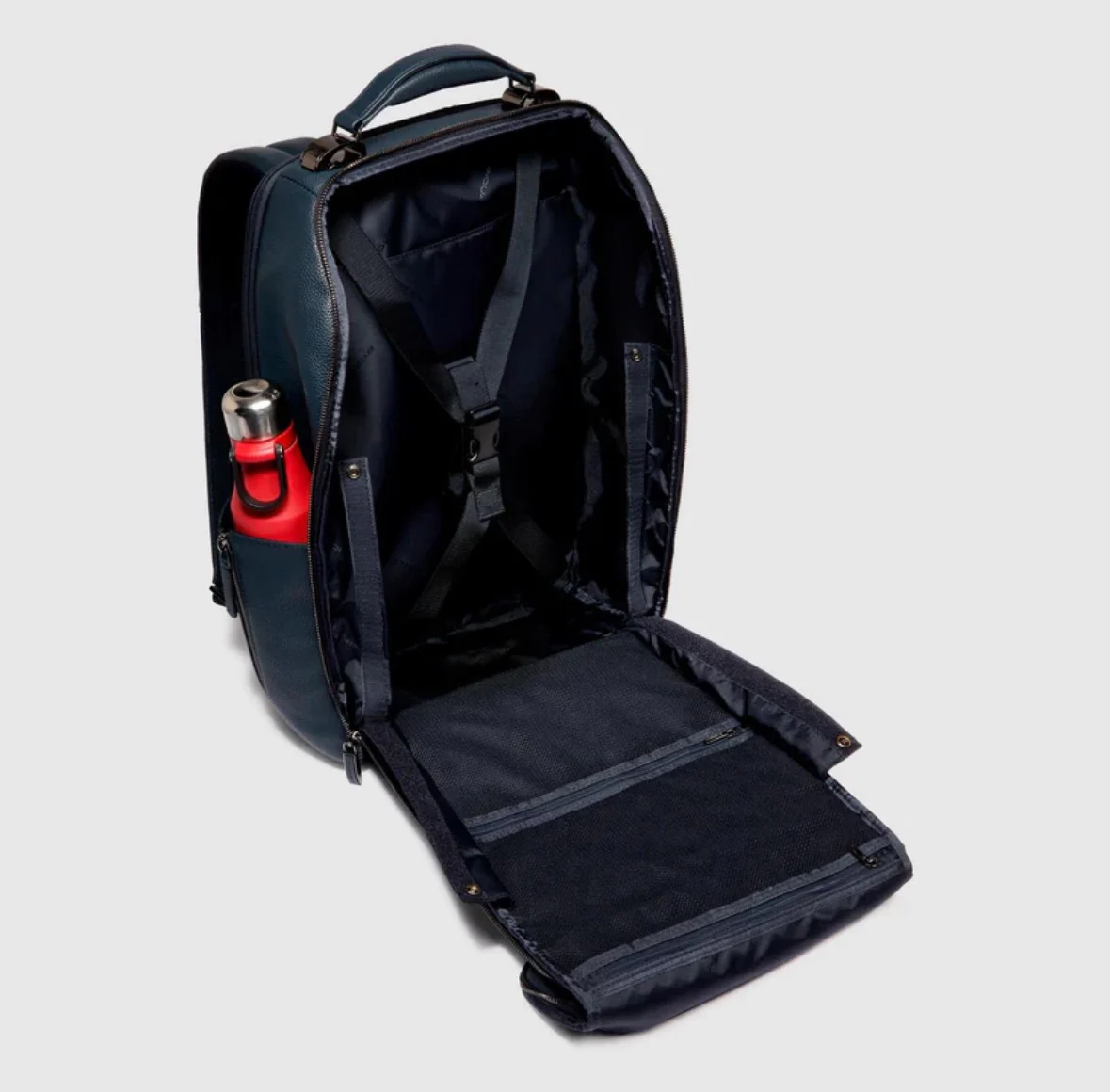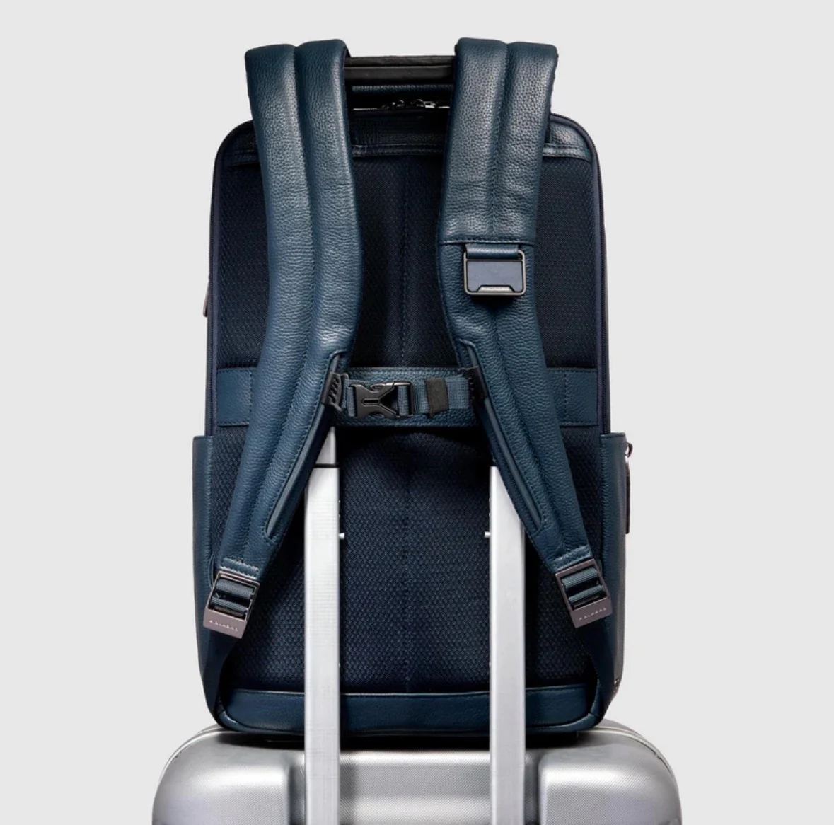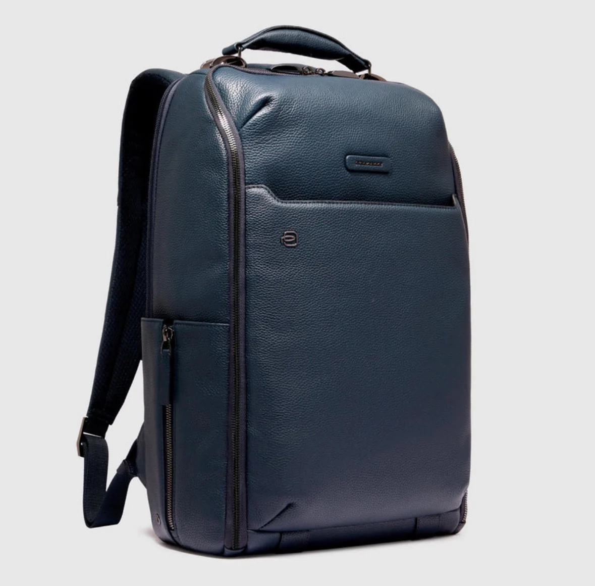 Da Piquadro, splendido zaino da viaggio in pelle a due comparti. Comparto porta pc 15.6″ e porta iPad imbottito anti urto e vano principale con elastici ferma abiti. L’apertura su tre lati lo rende ideale per il viaggio. Ampia tasca frontale chiusa con zip. Tasche laterali porta ombrello e porta bottiglia. Sul retro, sistema di aggancio al trolley e tasca nascosta con protezione RFID.