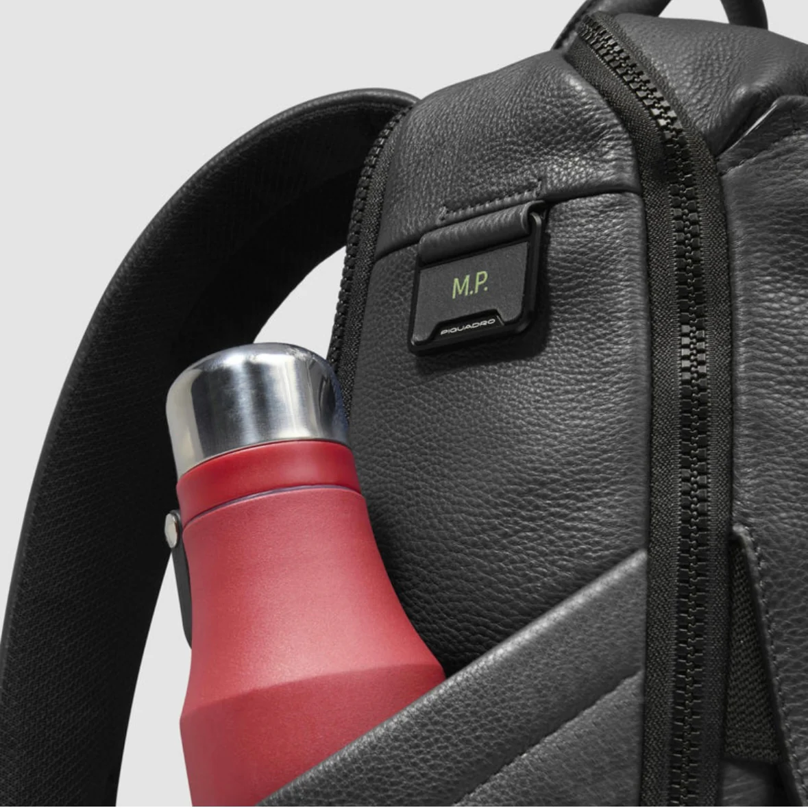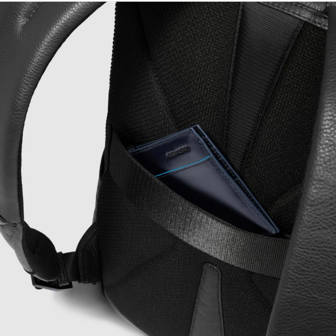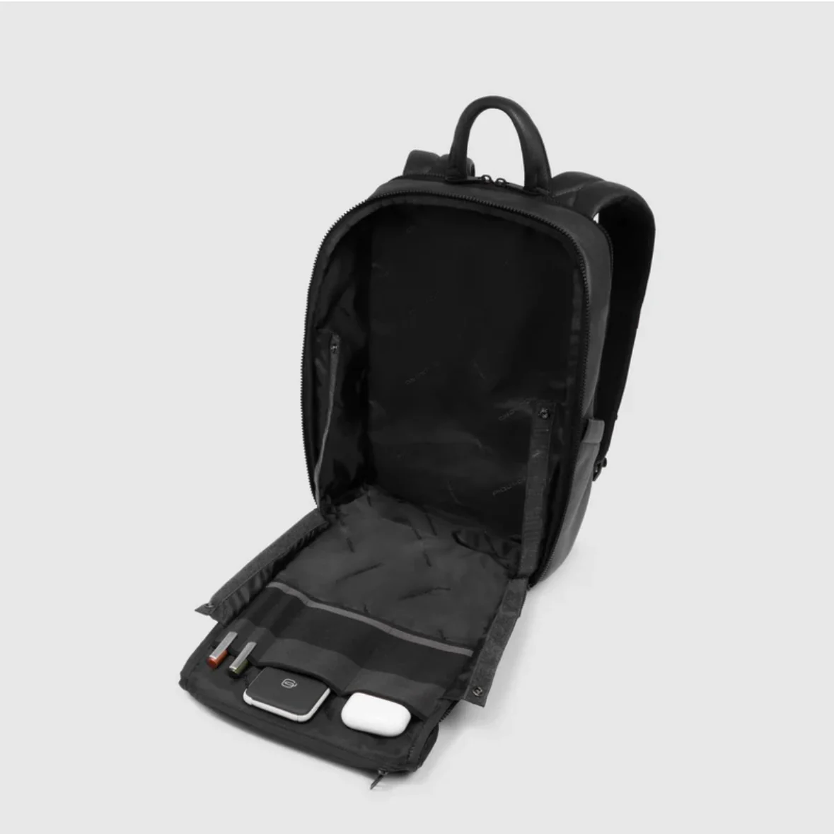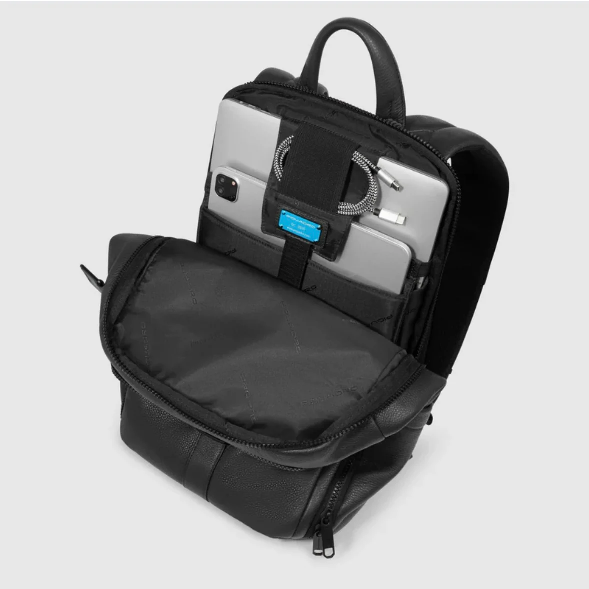 Piquadro zaino in pelle a due scomparti. Vano porta PC 14″ imbottito anti urto, con tasca porta iPad e porta cavi.
