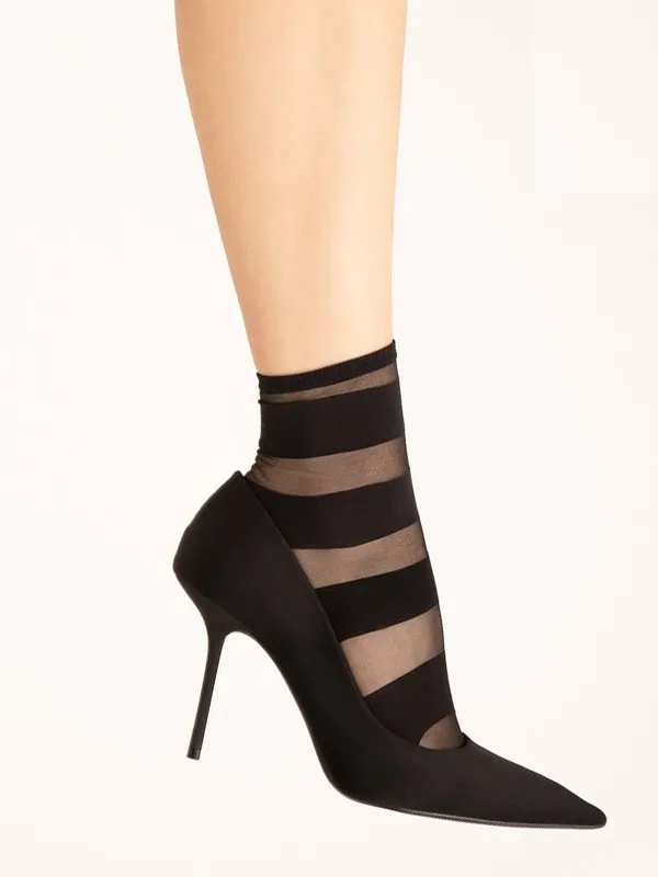 Women's sheer short socks (15 denier) in black with darker horizontal bands along the entire length. Fiore Collection