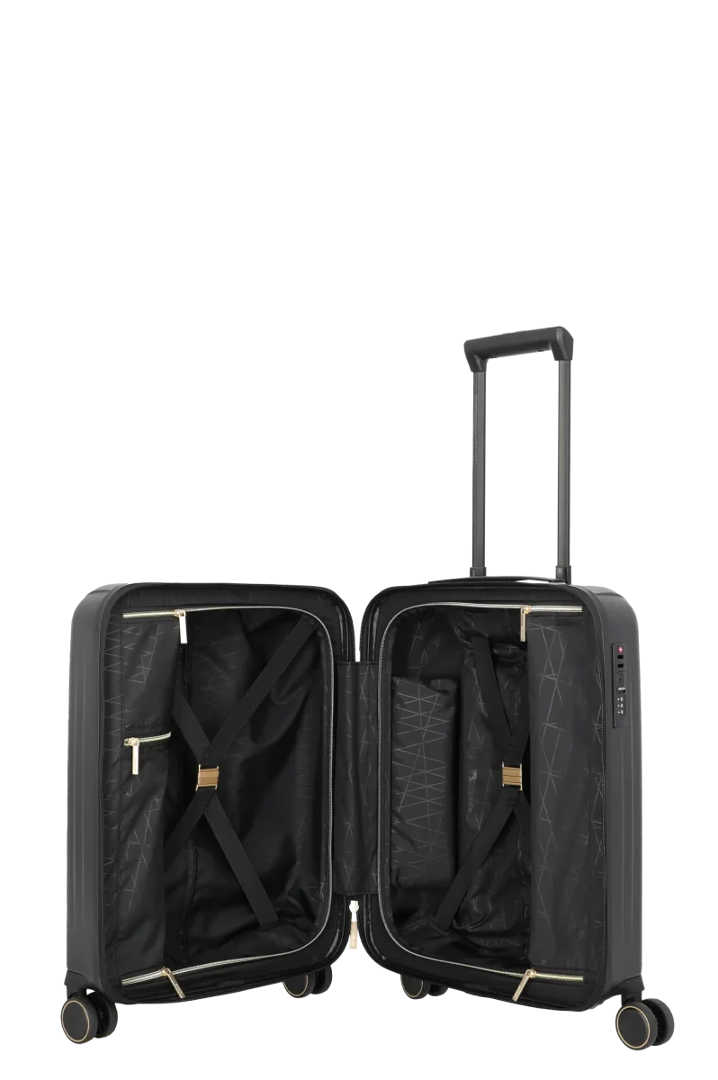 Allโinterno, il trolley รจ dotato di due scomparti principali con divisori in tessuto e cinghie ferma abiti, pensati per mantenere lโordine e proteggere il contenuto. La fodera interna, elegante e resistente, completa una struttura pensata per durare nel tempo.