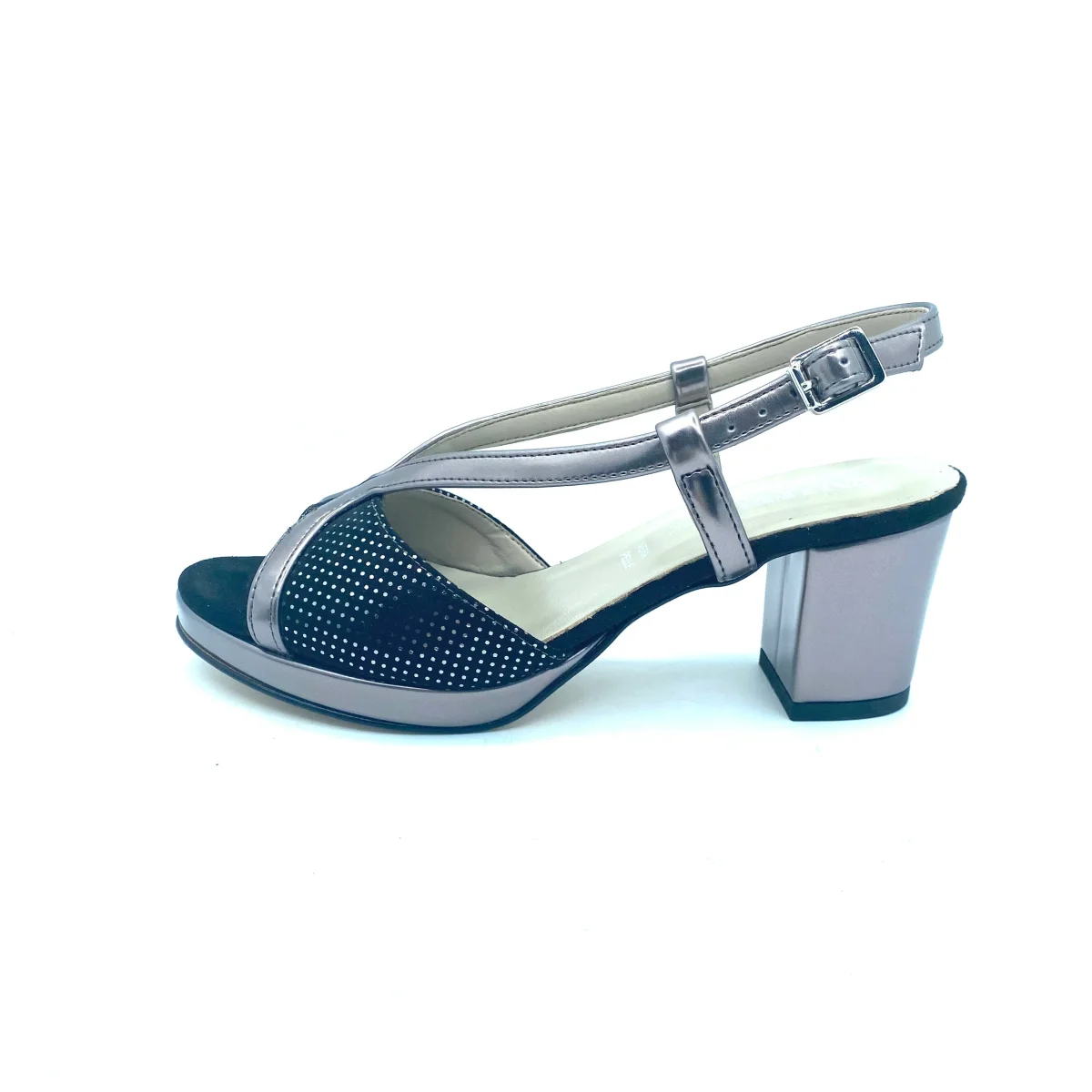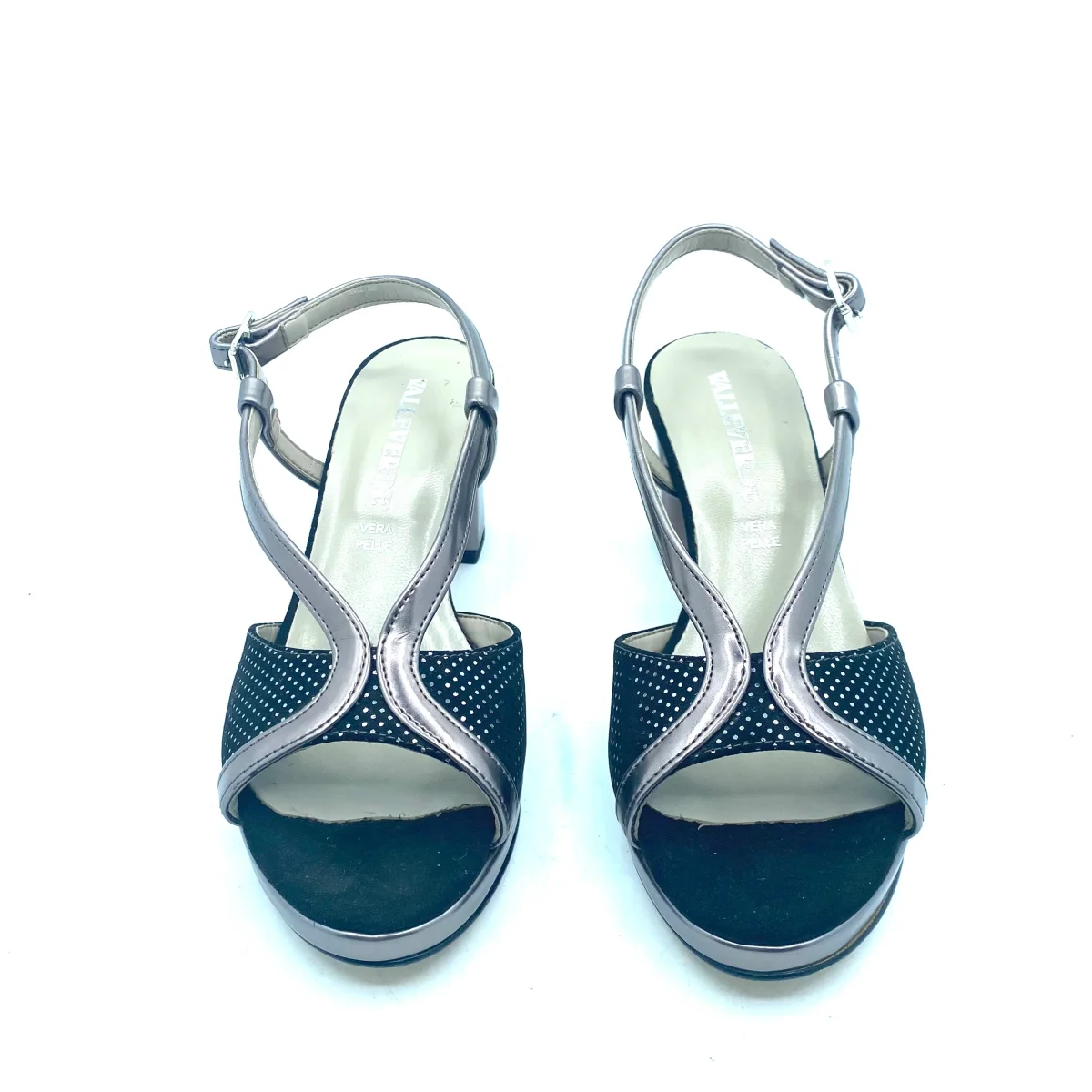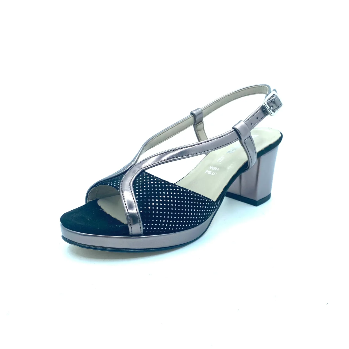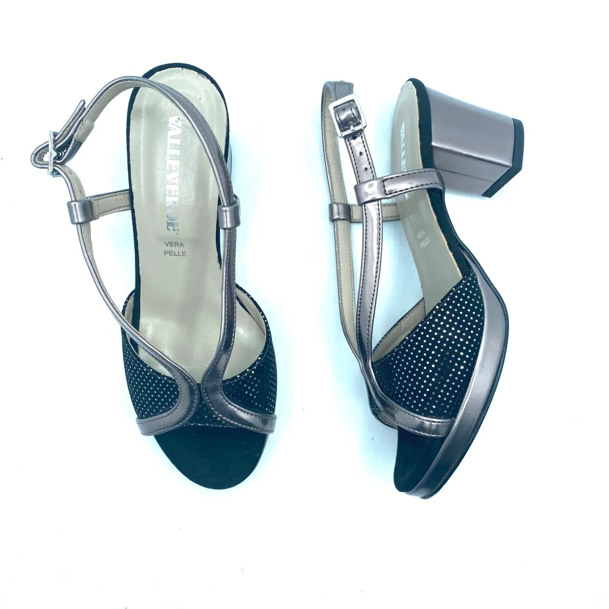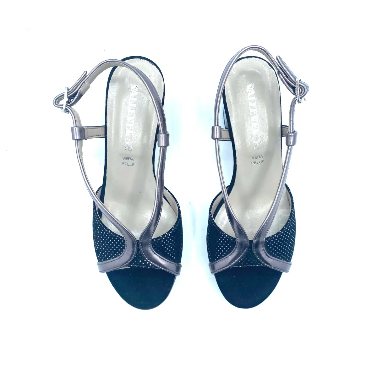 Sandali VALLEVERDE moda comoda numeri 35 in vera pelle di colore nero con pois e bronzo, con fondo in pelle, tacco 6 cm, zeppa 1,5 cm, soletta in pelle