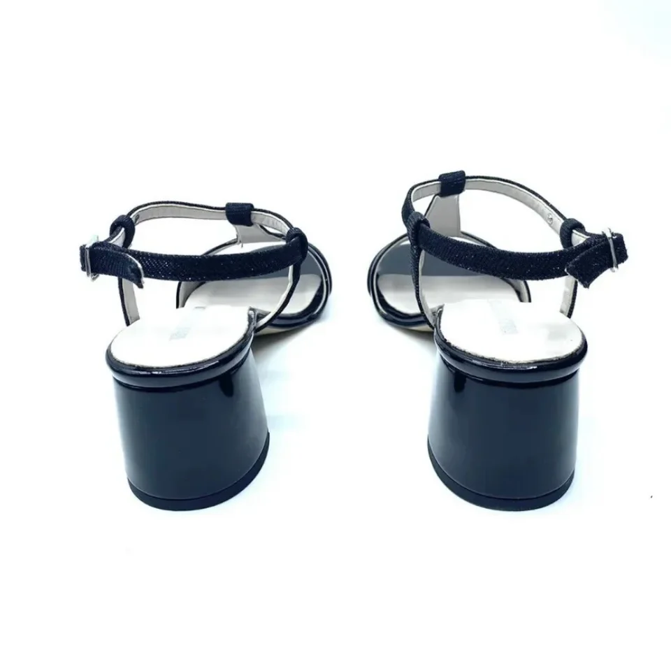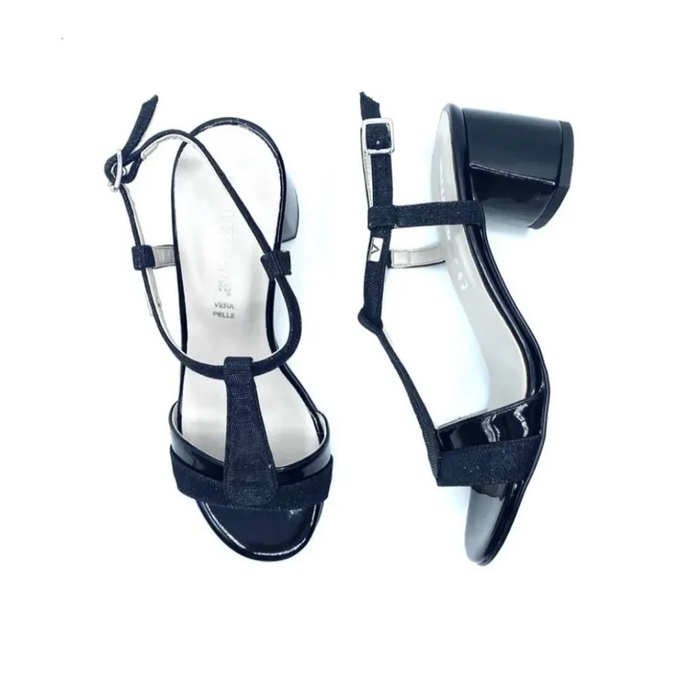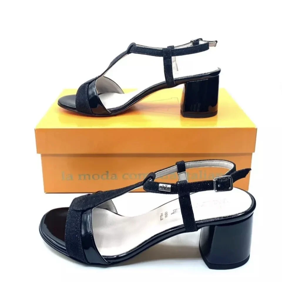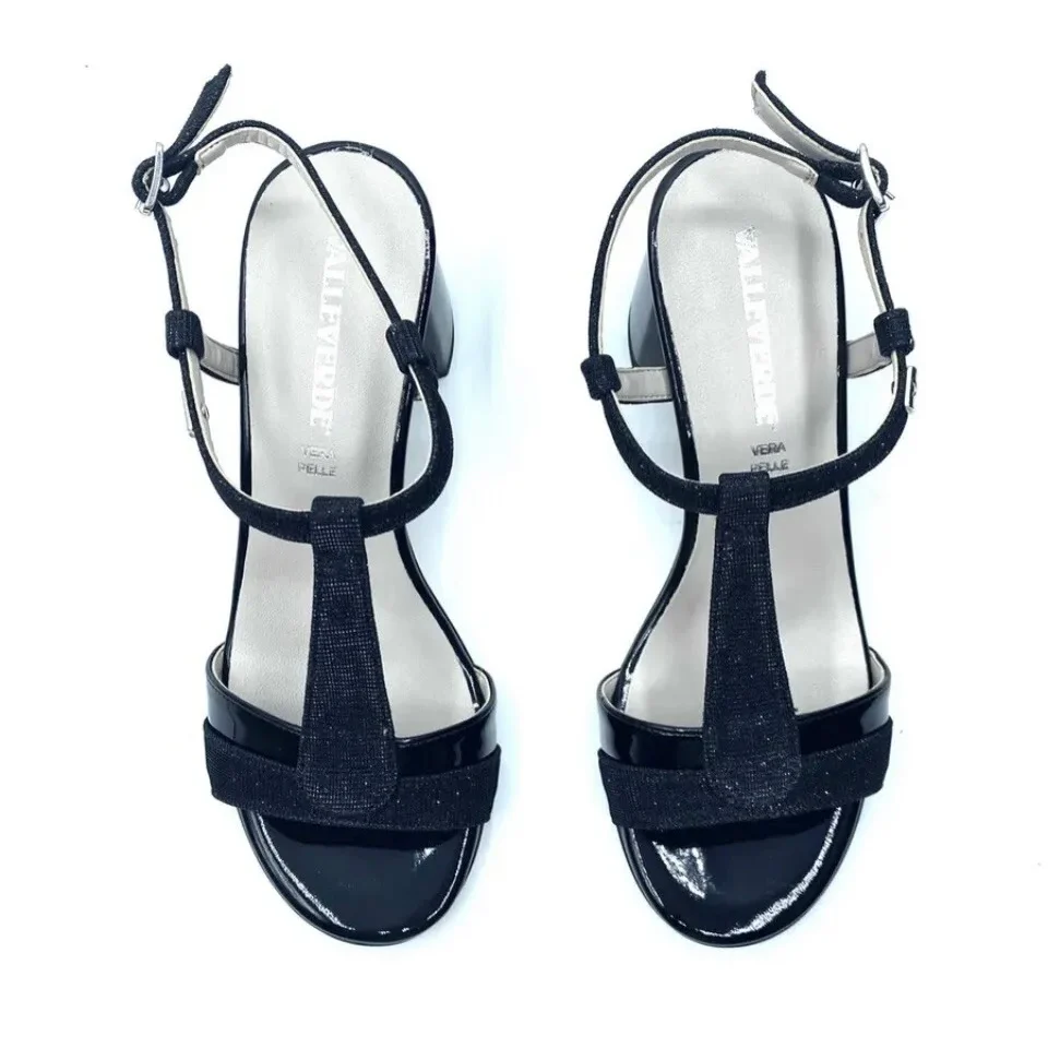 Sandali VALLEVERDE moda comoda numeri 38 in vera pelle di colore nero con una parte glittet ara, con suola in pelle, tacco 6 cm, soletta in pelle