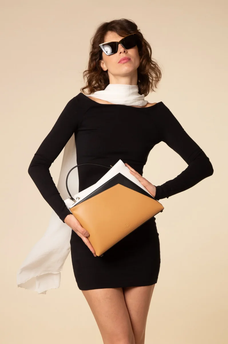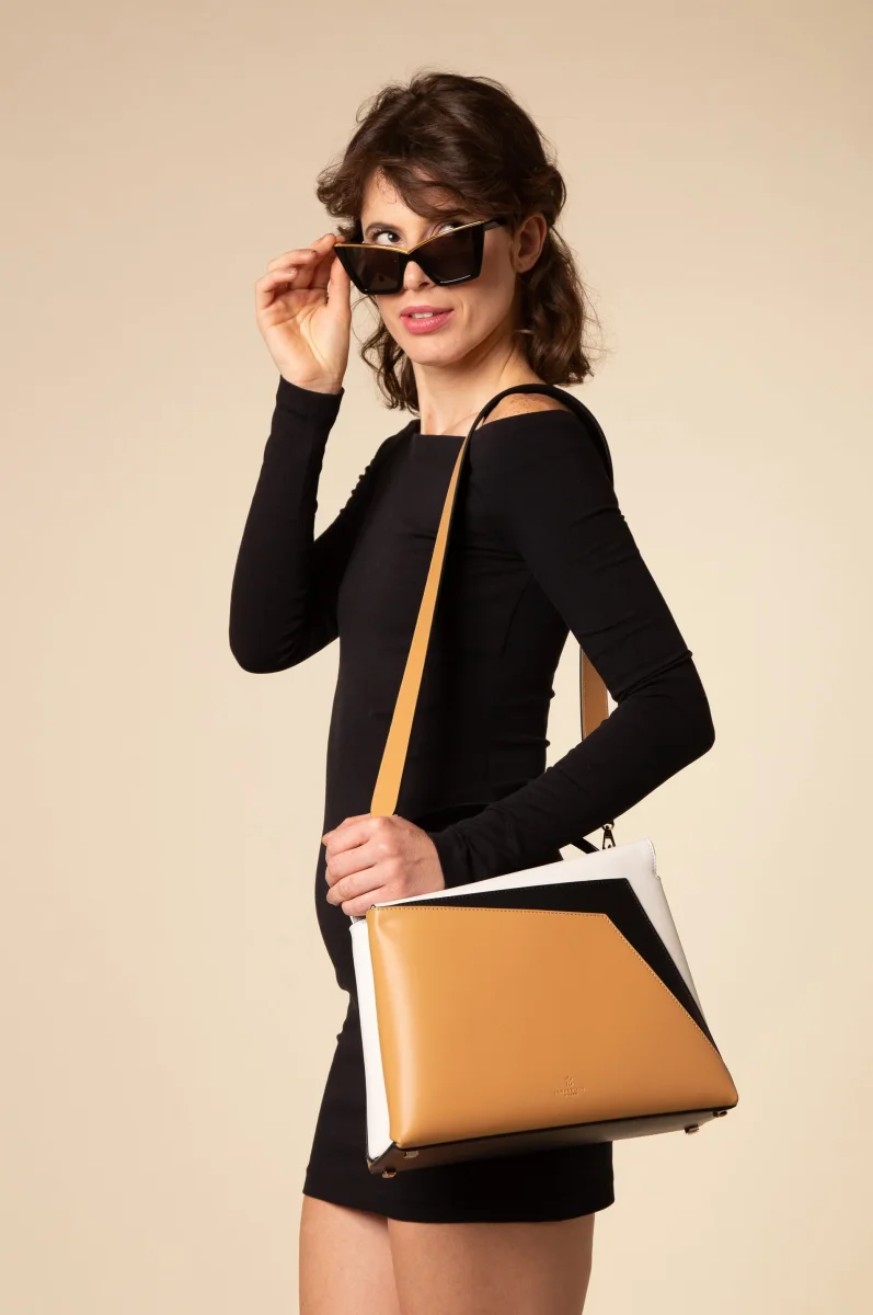 Vela Collage è una borsa Made in Italy fatta a mano in pelle di vitello con particolari forme geometriche che rimandano alle linee di una barca a vela. Dotata di manico fisso, tracolla rimovibile e ampie tasche con chiusura magnetica, è perfetta per qualsiasi situazione.