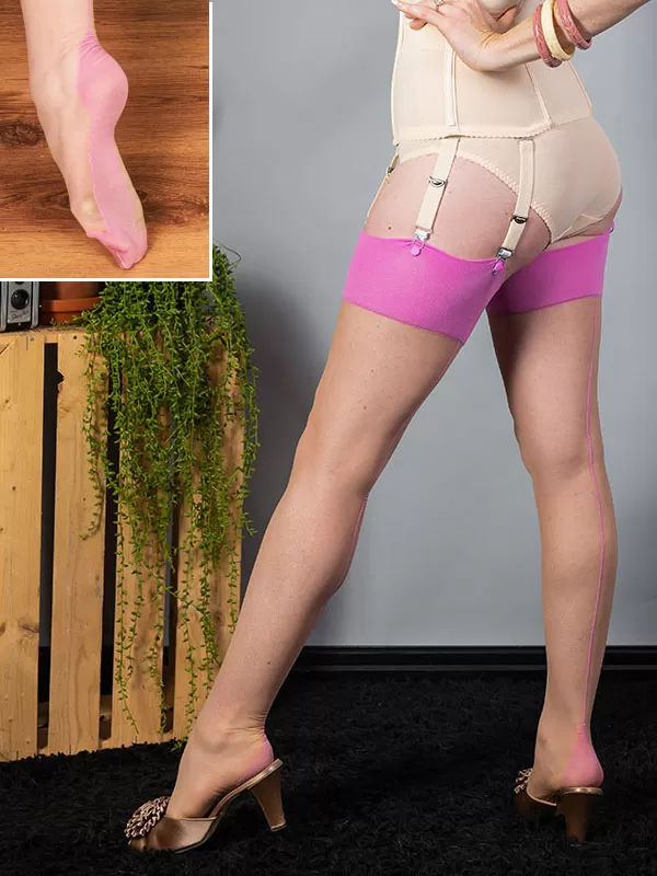 Sheer garter stockings, 15 denier, with a retro feel, champagne color with ruffle, back seam, and pink foot. The lace is 10 cm high and is made of soft stretch fabric that will enhance your legs without constricting them. The back seam runs the entire length of the leg and ends with an embroidered heel with irregular edges that also extends under the foot and onto the toe. The stockings contain nylon and elastane, which guarantee an excellent fit, a perfect combination of the glamour of yesteryear and the comfort of today. These vintage-style stockings are inspired by the original…