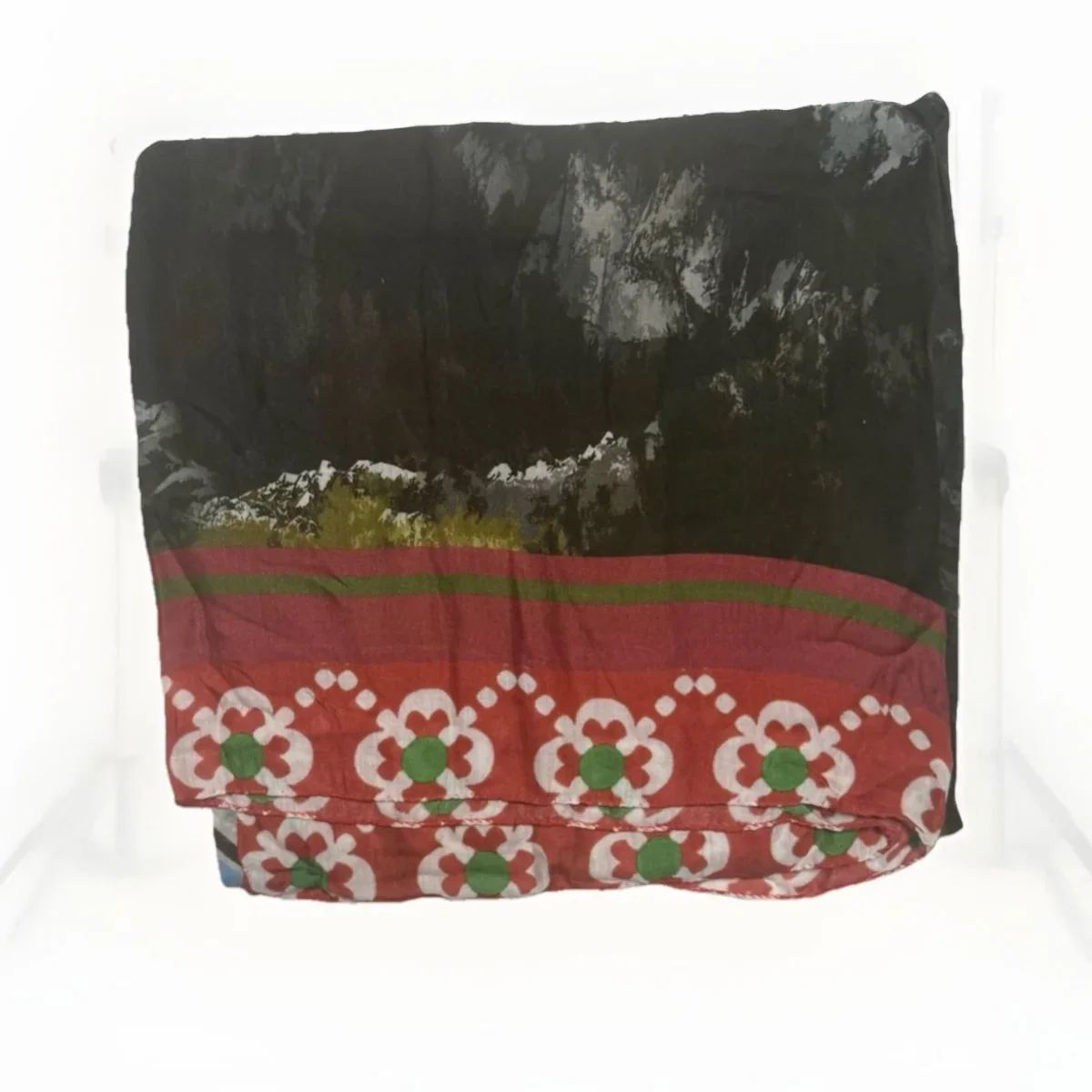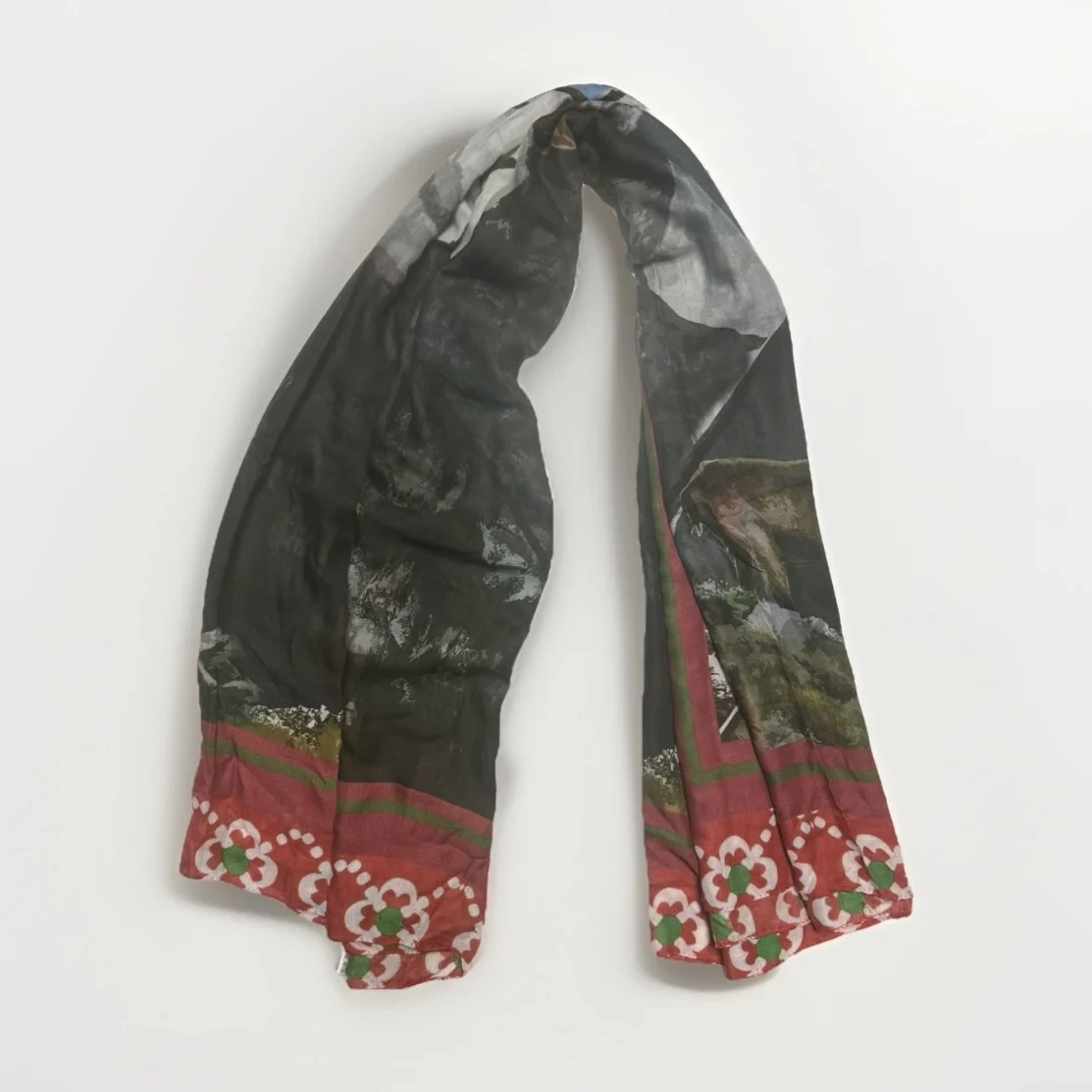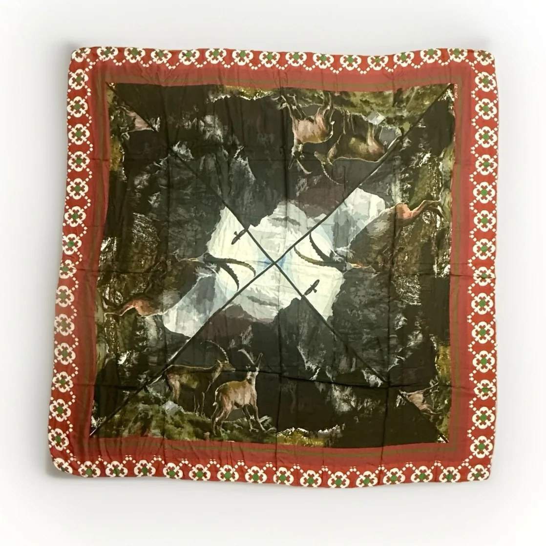 Von & Zu Sciarpa cucita a mano con stampa di cervi e paesaggio montano. Presenta un bordo decorativo con motivi floreali. Bordi cuciti a mano. Misura 140 x 140 cm 90% modal 10% cachemire Made in italy SCIARPA NUOVA SENZA CARTELLINO