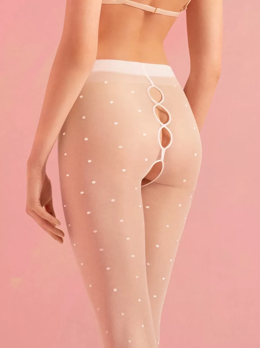 Unique white tights with lots of little polka dots, three oval openings at the back, and an open crotch. Sheer tights (20 denier) with a smooth elastic waistband and flat seams. Fiore Collection