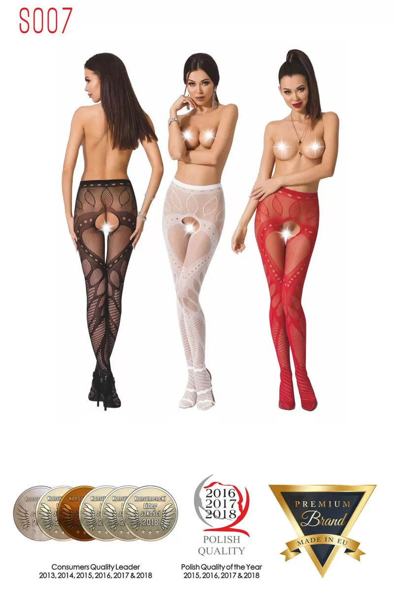 White fishnet tights with an open crotch, multi-weave, featuring numerous openwork details and patterns for a truly unique design!