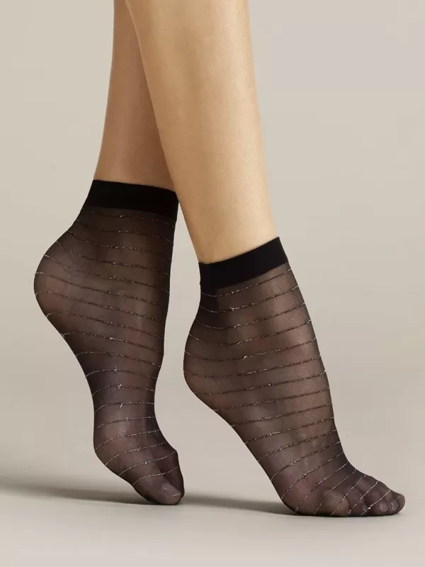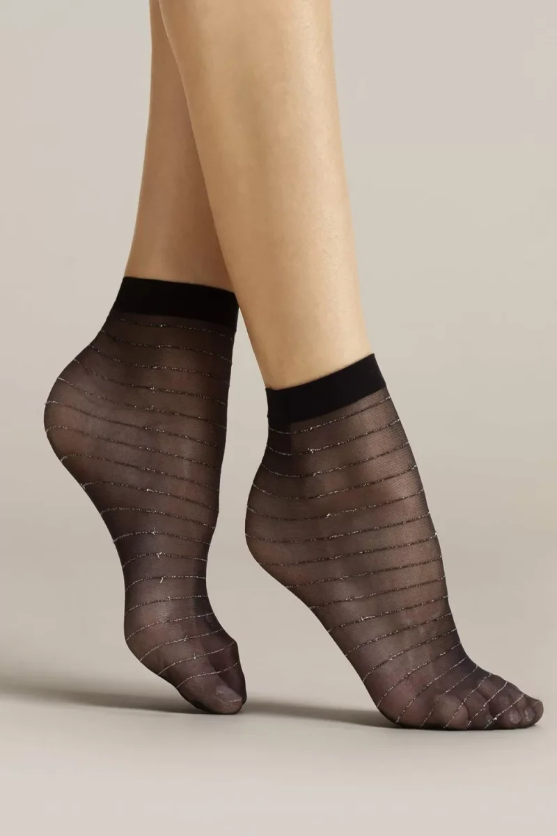 Sexy women's short socks, sheer, with horizontal stripes in silver lurex. 20 denier