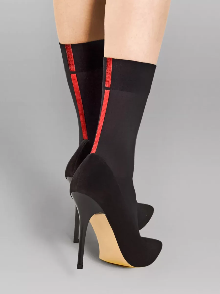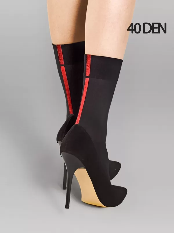 Women's calf-length socks in opaque black with a sexy red stripe down the back. 40 denier
