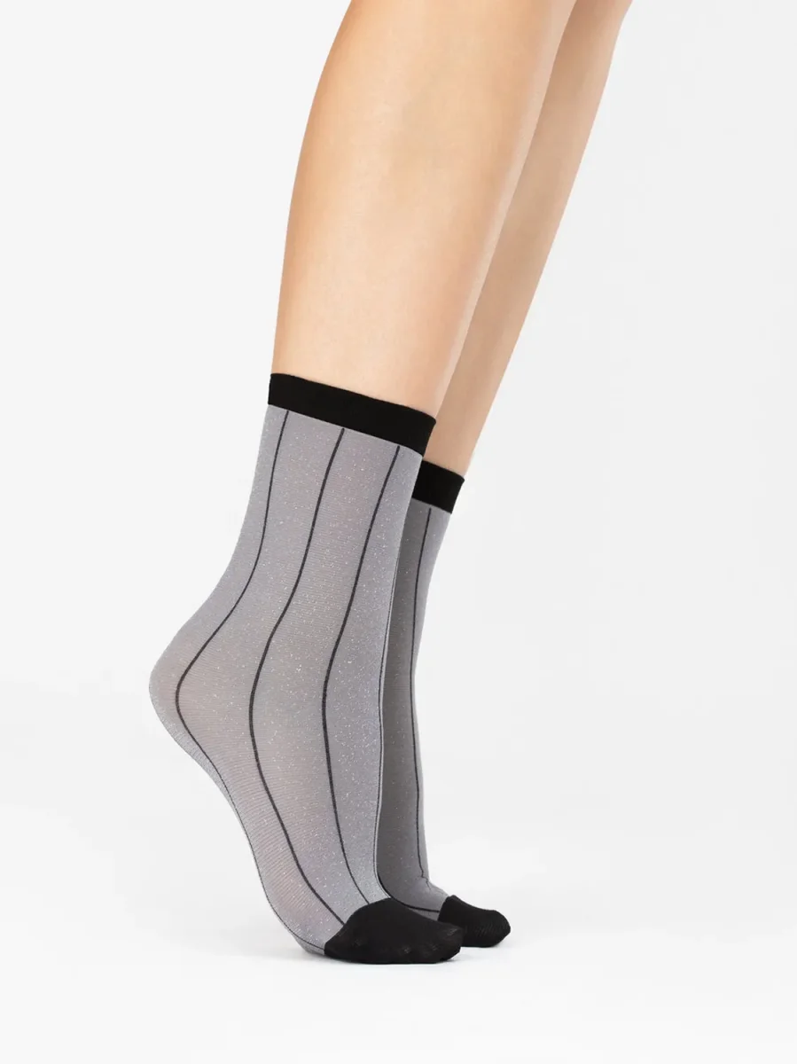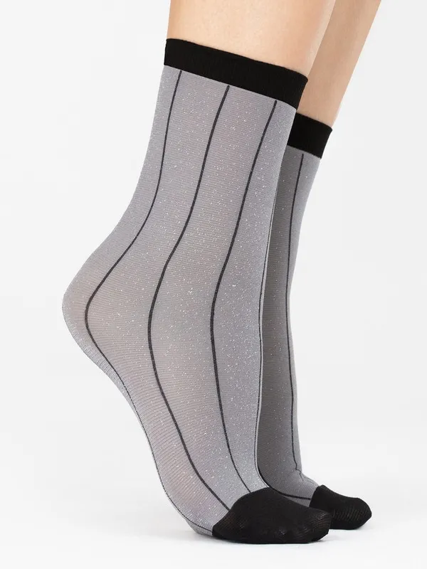Women's gray short socks with silver lurex inserts. Socks featuring thin vertical stripes, contrasting black toe and ankle band.40 denier FioreCollection