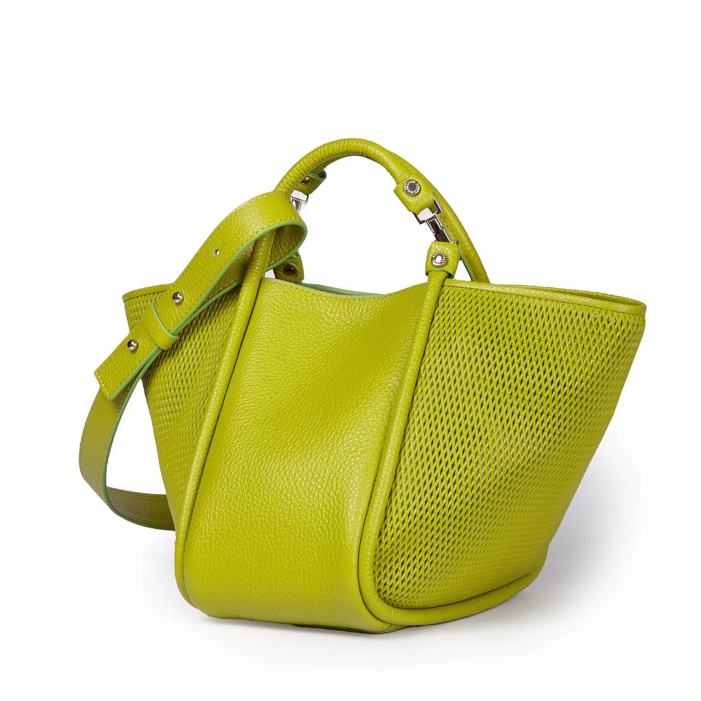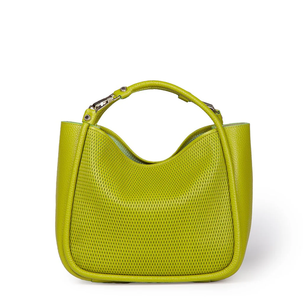 Morbida pelle martellata sapientemente micro-perforata con questo esclusivo design “a rete” che crea un’effetto vedo non vedo sui lati principali e delicatamente bordato e rifinita nella stessa pelle.