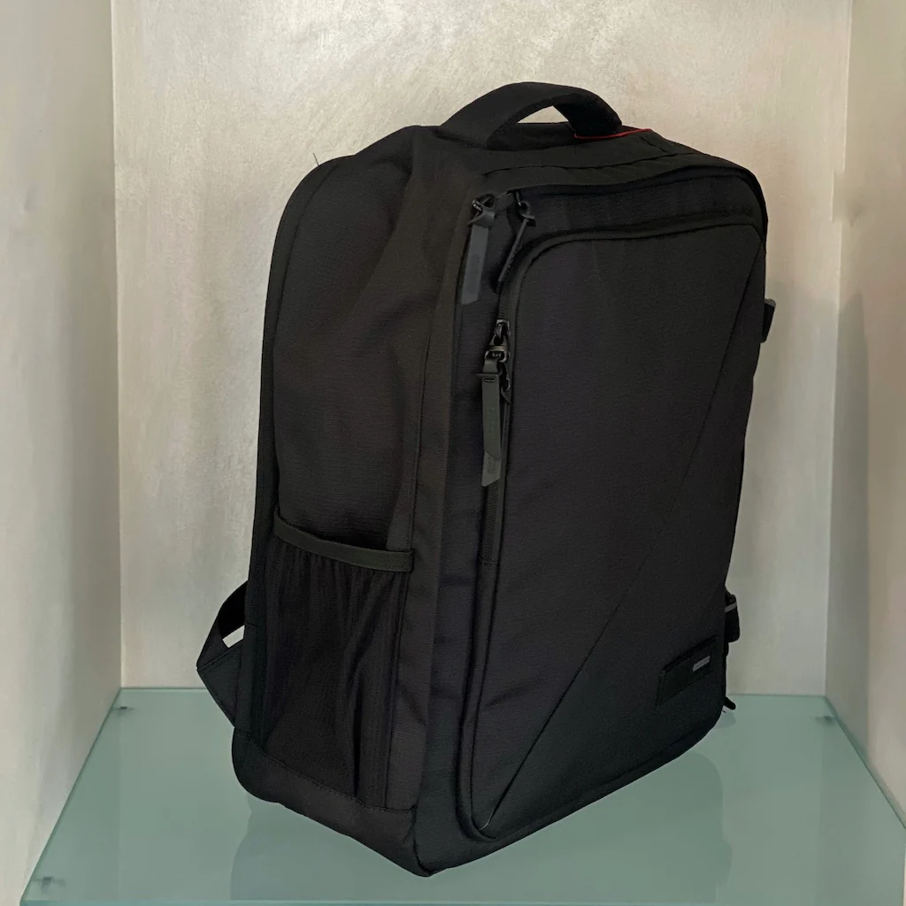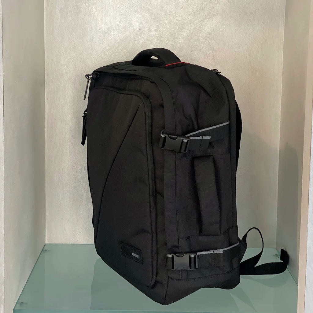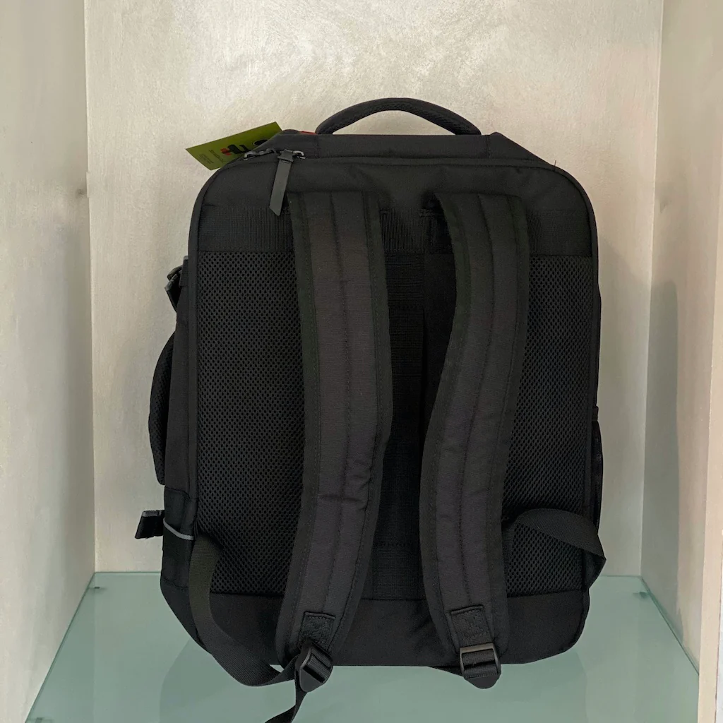 Zaino da viaggio leggero ed organizzato cm 45 x 20 x 36. Tasca laterale porta bottiglia. Portabilità a zaino o a cartella. Interno dotato di elastici ferma indumenti. Vano imbottito porta PC 15,6″ Tasca frontale chiusa con zip. Sul retro, sistema di aggancio al trolley. Volume 38,5 lt. Peso 0,7 kg Colore: nero