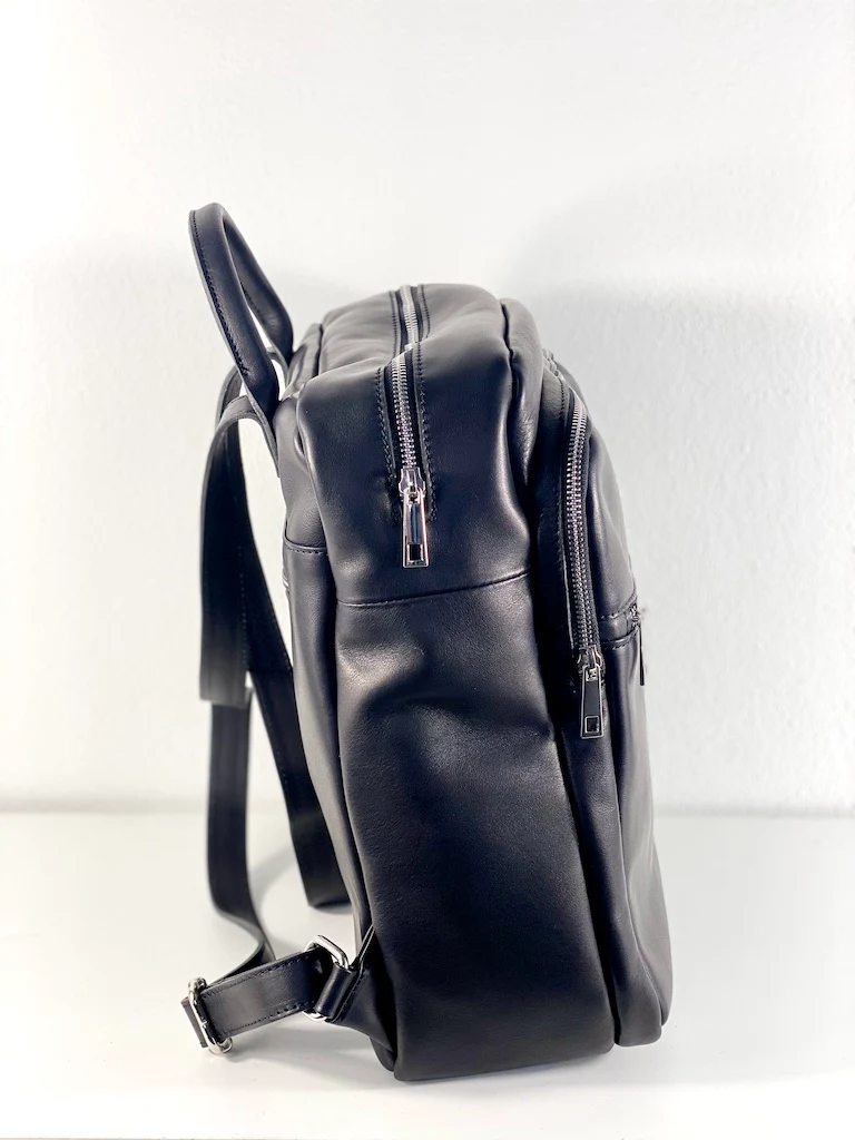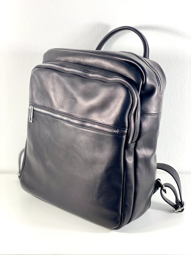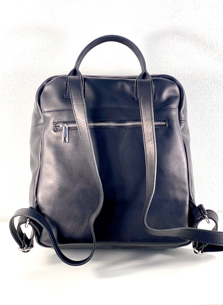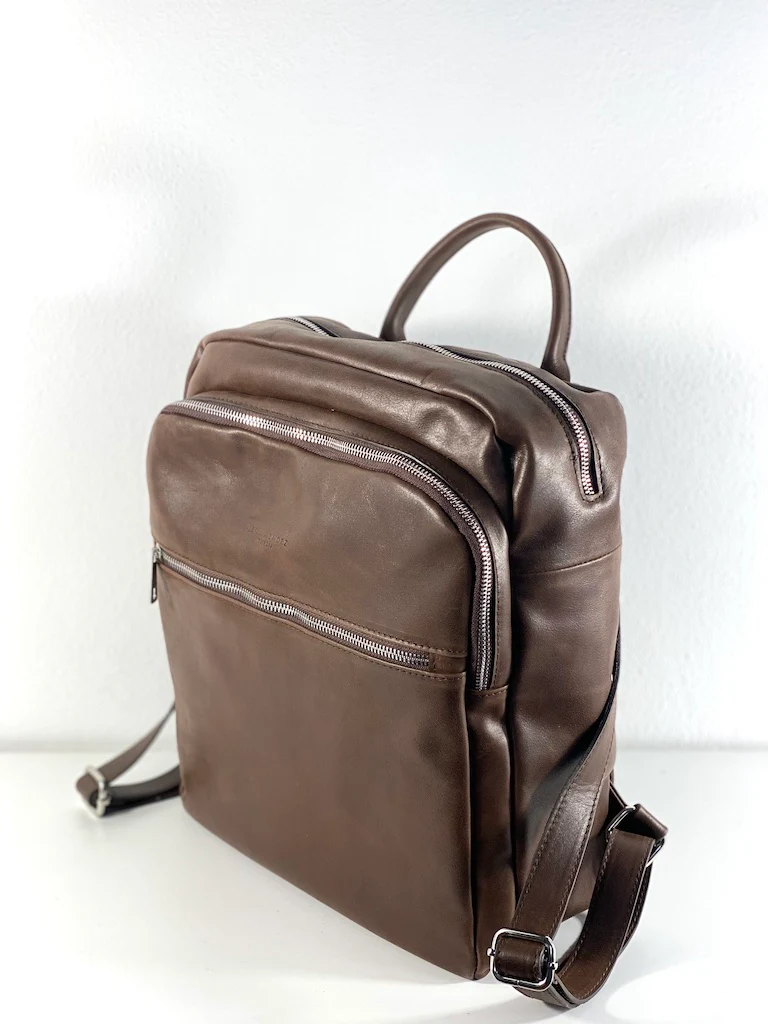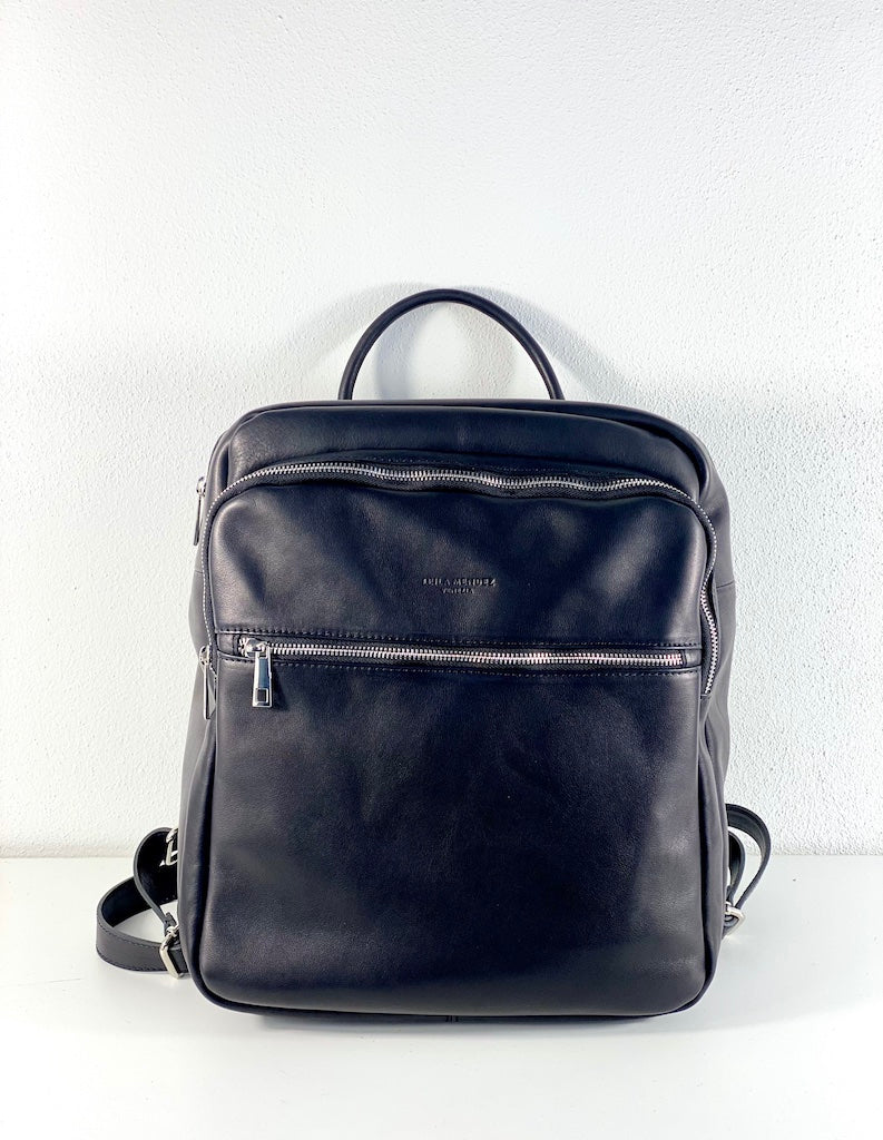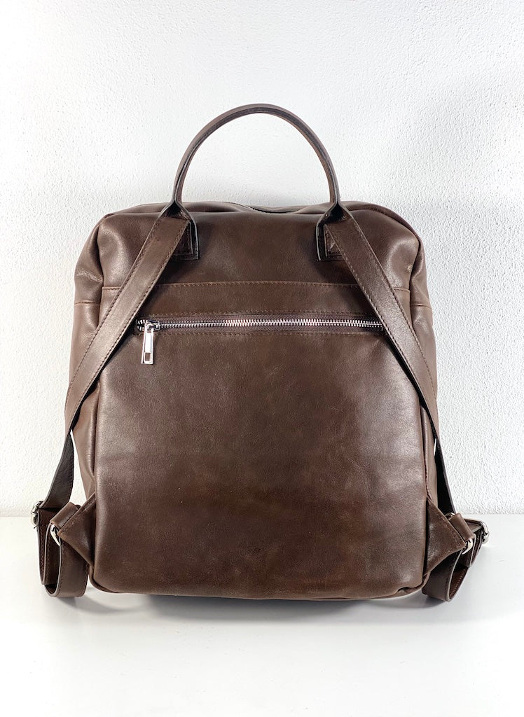 Zaino uomo in pelle di produzione artigianale con due comparti e tasca frontale.Comparto principale chiuso con zip, dotato di taschino interno aperto e taschino con chiusura a zip.Comparto frontale chiuso con zip, ampio 2,5 cm.Tasca frontale.Accessori bruniti, fodera interna in tessuto colore nero.Spallacci regolabili.Misure cm 32 x 13 x 34 Made in Italy