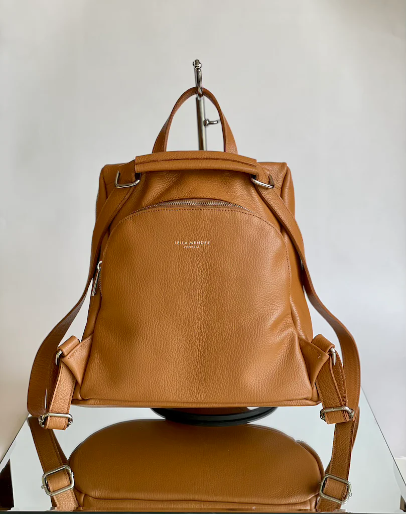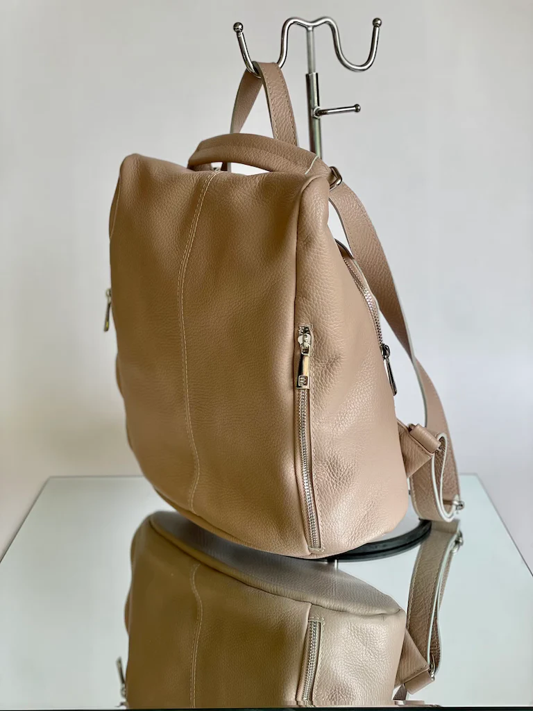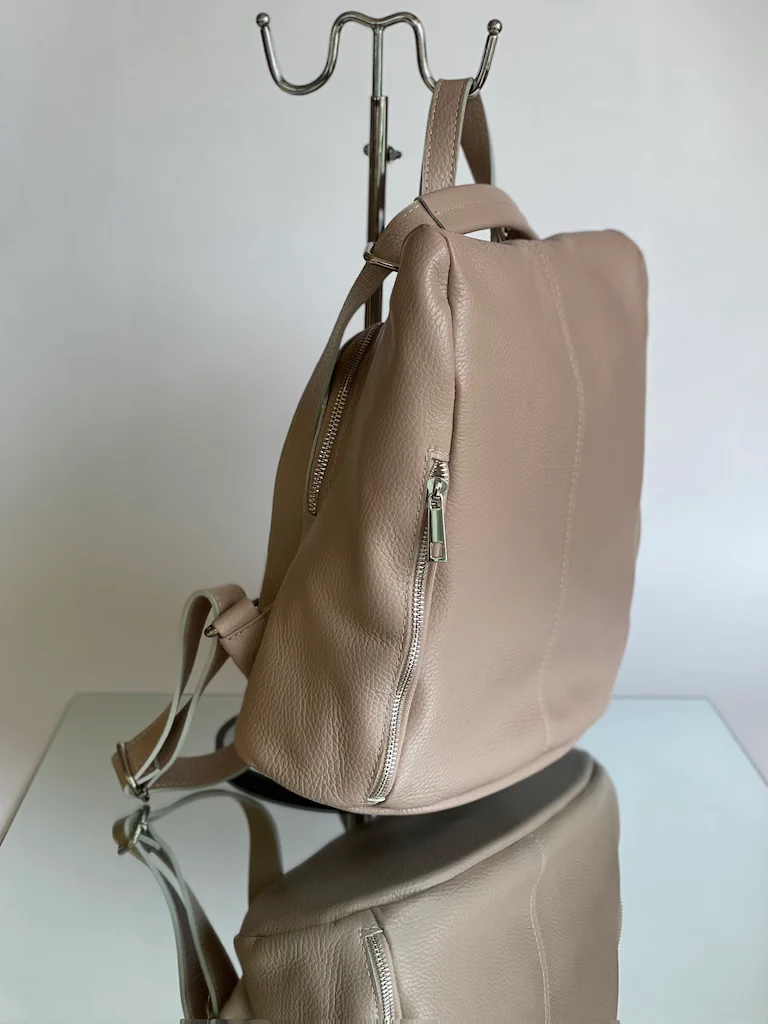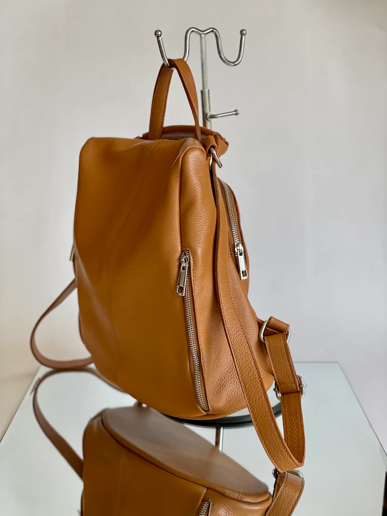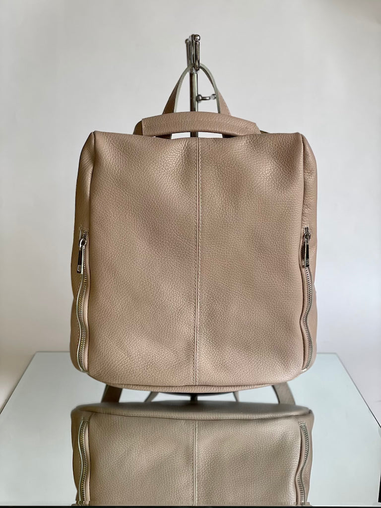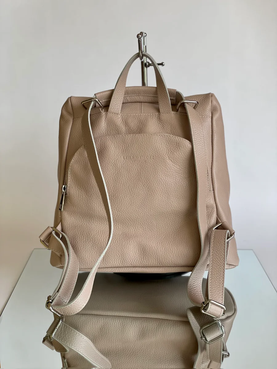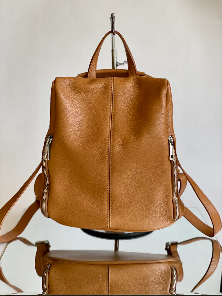 Zainetto in pelle con apertura sul retro antifurto. Dotato di due comode tasche sulla parte frontale chiuse con zip.