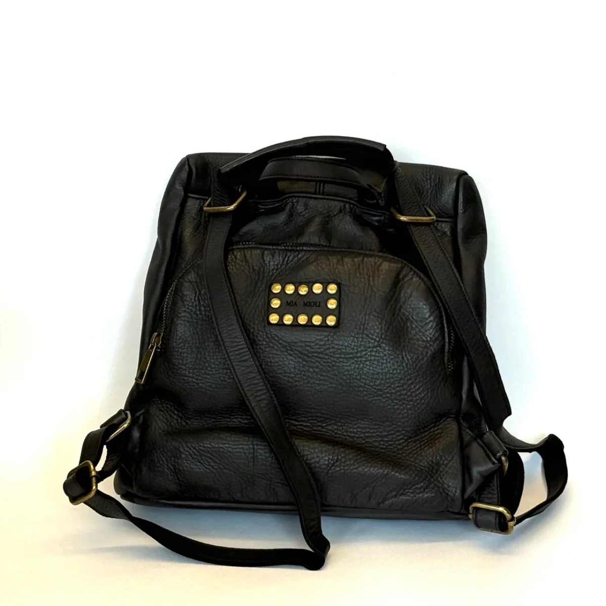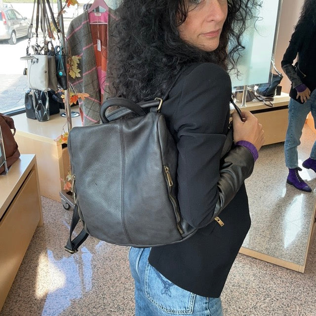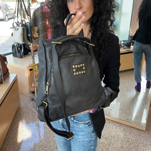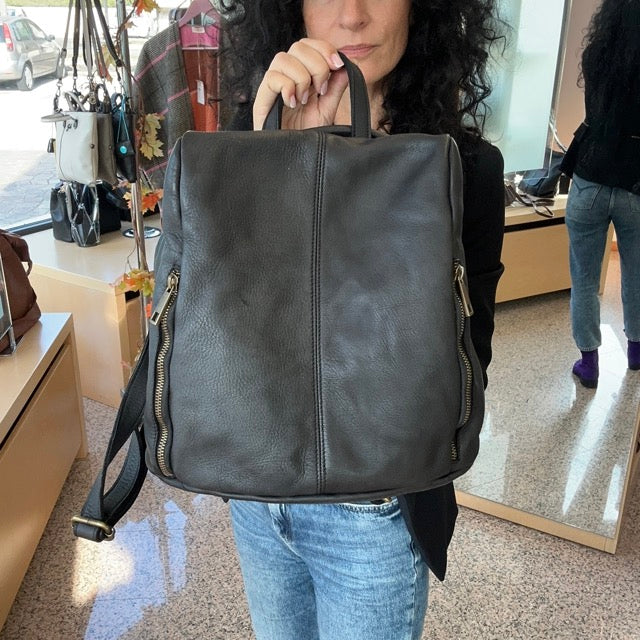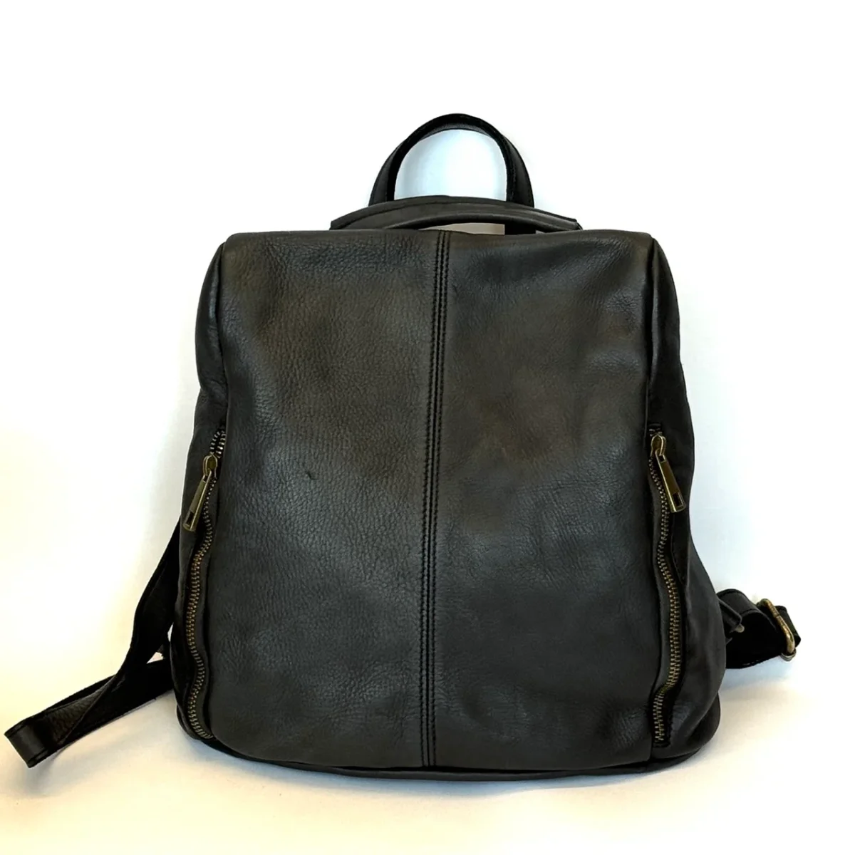 Zainetto in morbida pelle dal trattamento vintage con apertura sul retro antifurto. Dotato di due comode tasche laterali chiuse con zip.