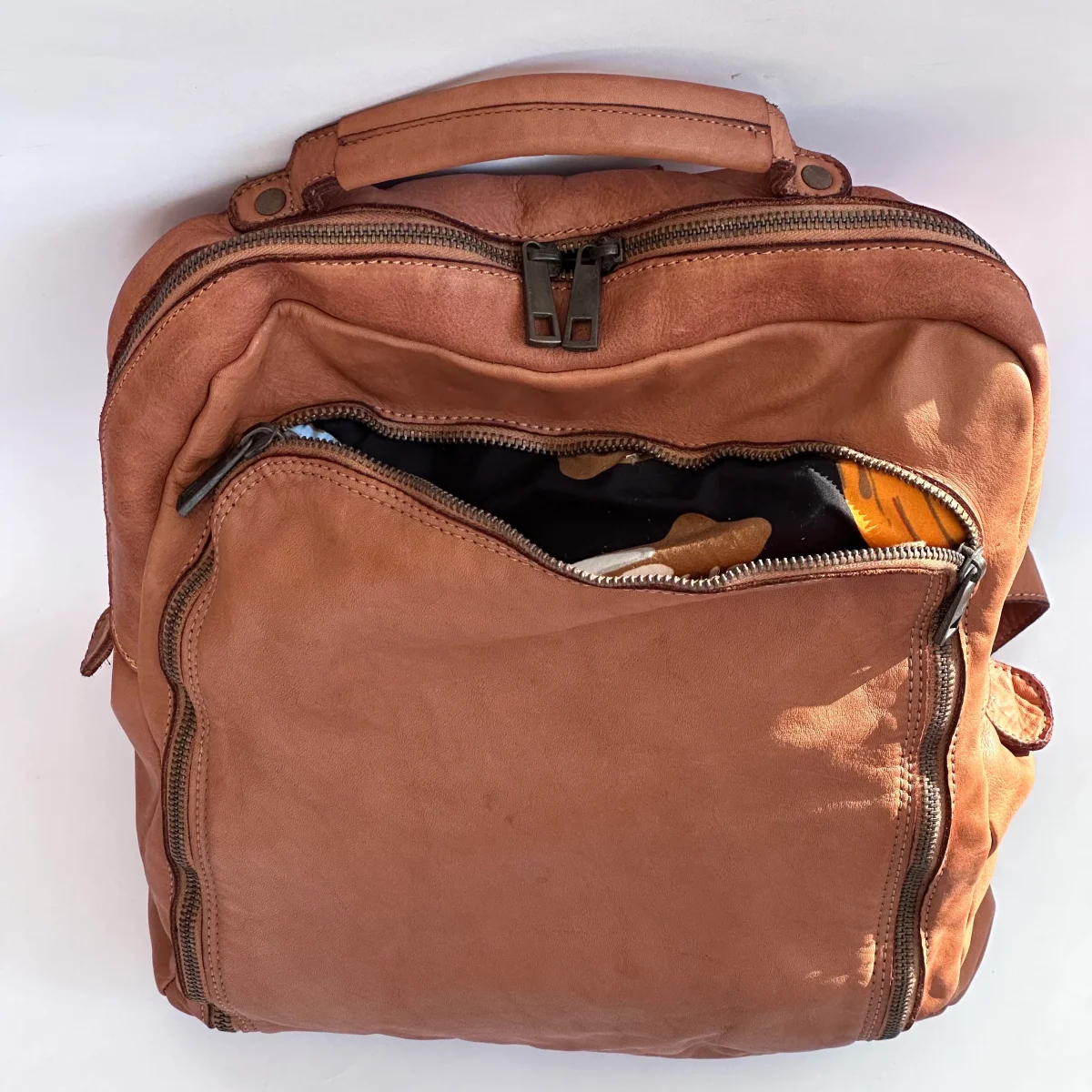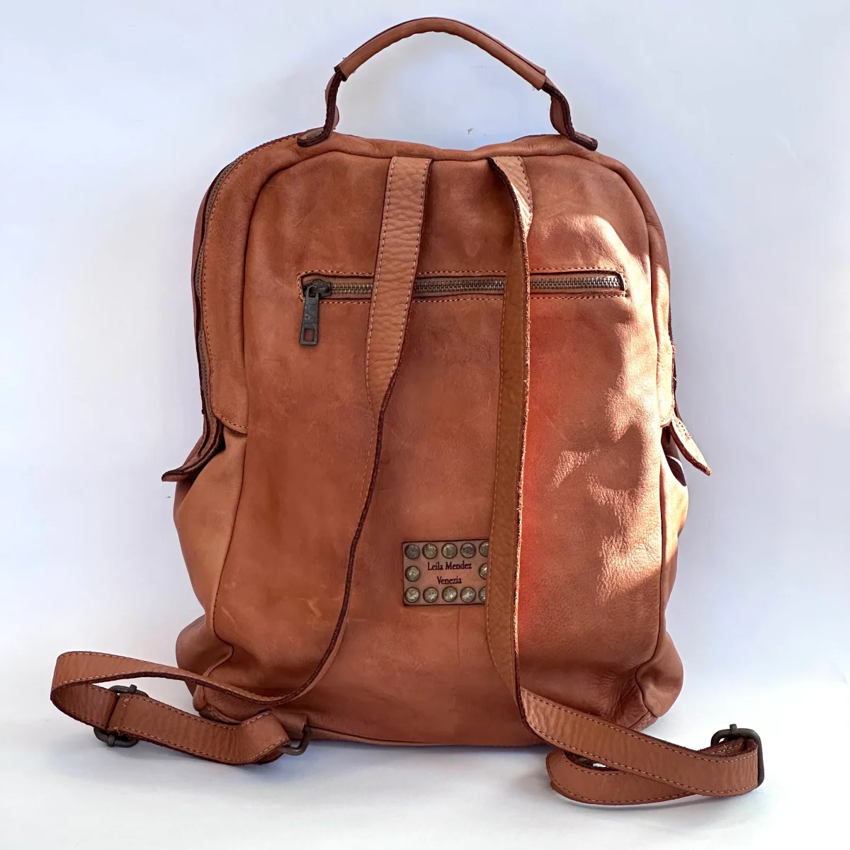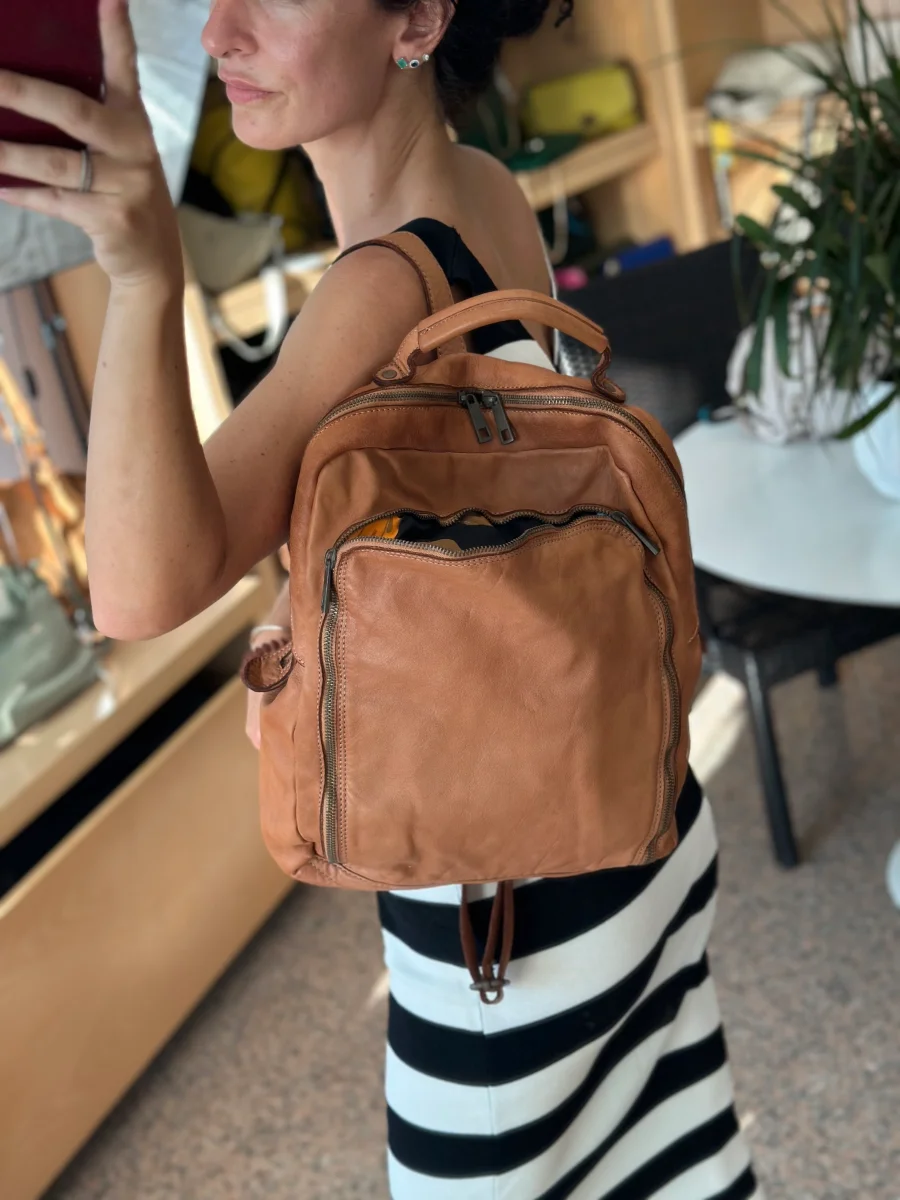 Zaino in morbida pelle vintage a due scomparti con tasca sul retro chiusa con zip. Capiente vano centrale dotato di una piccola tasca interna, vano frontale con comoda apertura con cerniera e tasca interna porta cellulare di veloce accesso.