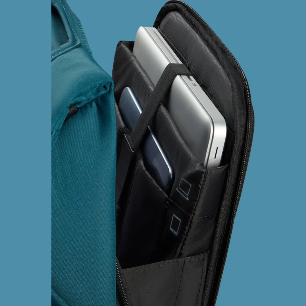 Da Samsonite, uno zaino antifurto con apertura sul retro e comode tasche chiuse con zip. Realizzato in tessuto resistente ai tagli. Dettaglio riflettente. Spallacci ergonomici.